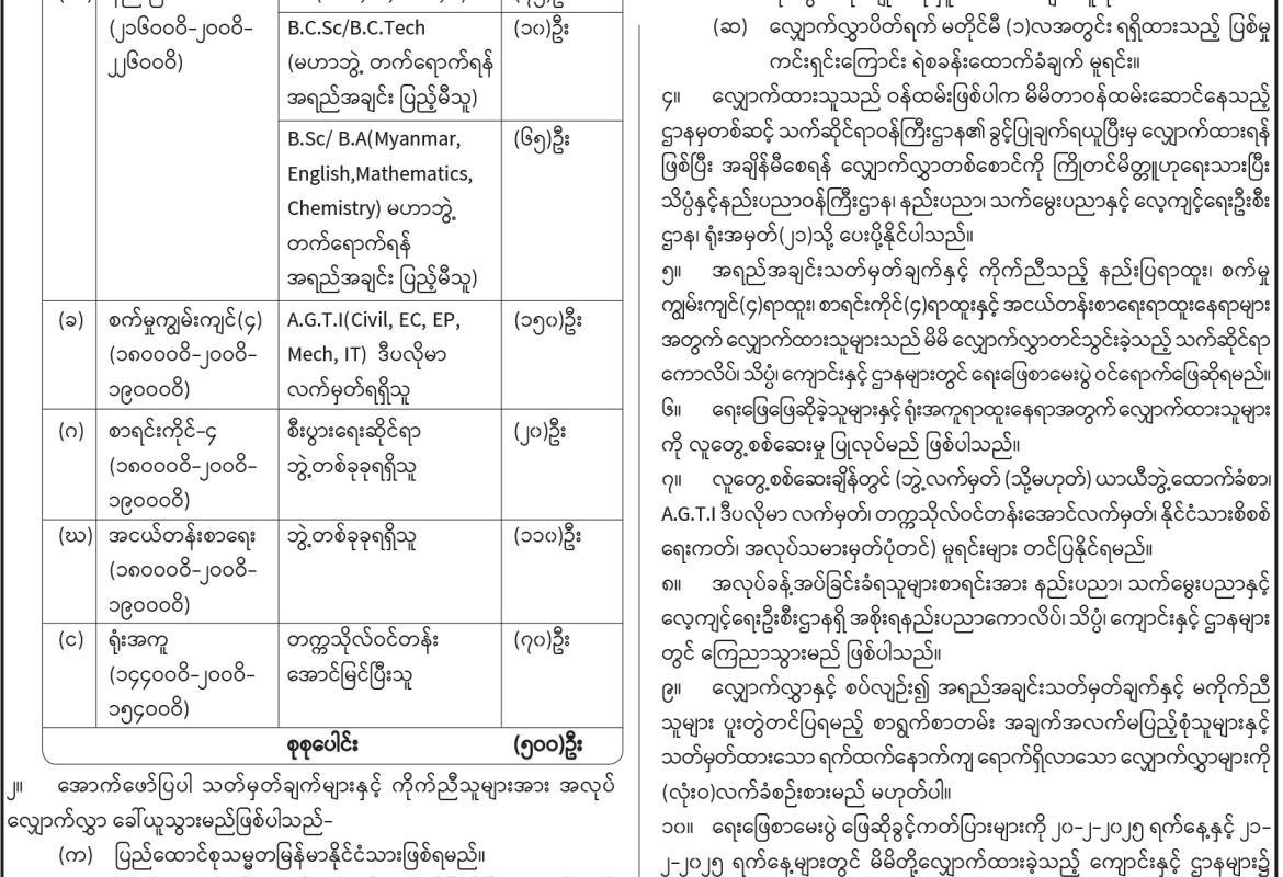 သိပ္ပံနှင့်နည်းပညာဝန်ကြီးဌာန၊ နည်းပညာ၊ သက်မွေးပညာနှင့် လေ့ကျင့်ရေးဦးစီးဌာန၊ အစိုးရနည်းပညာ ကောလိပ်/သိပ္ပံ/ကျောင်းနှင့် ဌာနများတွင် လစ်လပ်လျက်ရှိသော အမှုထမ်း (သင်ကြား/ စီမံ) ရာထူးနေရာများအတွက် လျှောက်လွှာခေါ်