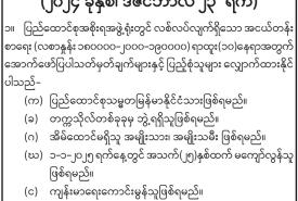 ပြည်ထောင်စုအစိုးရအဖွဲ့ရုံးတွင် လစ်လပ်လျက်ရှိသော အငယ်တန်းစာရေး ရာထူး (၁၀) နေရာအတွက် ဖော်ပြပါသတ်မှတ်ချက်များနှင့် ပြည့်စုံသူများ လျှောက်ထားနိုင်