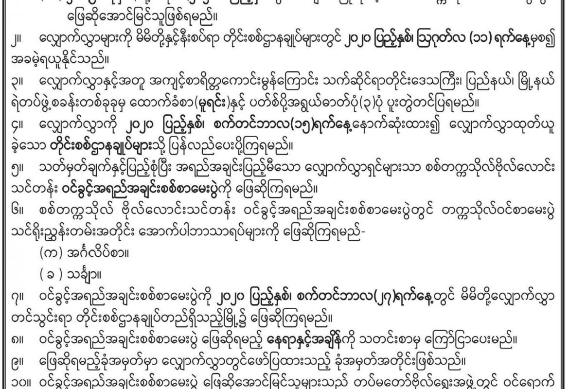 ပြည်ထောင်စုရွေးကောက်ပွဲကော်မရှင်ရုံးနှင့် တိုင်းဒေသကြီး၊ ပြည်နယ်၊ ပြည်ထောင်စုနယ်မြေအတွင်းရှိ ရွေးကောက်ပွဲကော်မရှင်အဖွဲ့ခွဲရုံးများတွင် လစ်လပ်လျက်ရှိသော အငယ်တန်းစာရေး ရာထူးနေရာများအတွက် လျှောက်လွှာခေါ်ယူခြင်း