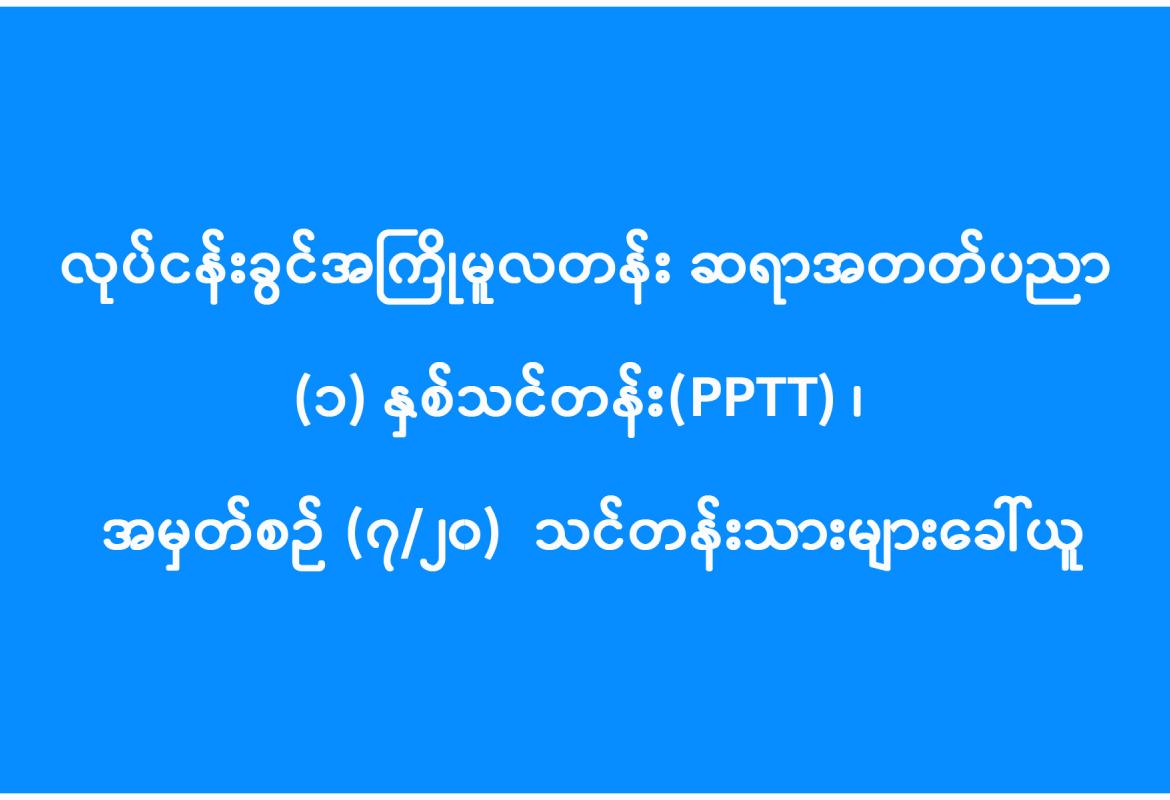 လုပ်ငန်းခွင်အကြိုမူလတန်း ဆရာအတတ်ပညာ (၁) နှစ်သင်တန်း(PPTT) ၊ အမှတ်စဉ် (၇/၂၀) သင်တန်းသားများခေါ်ယူ