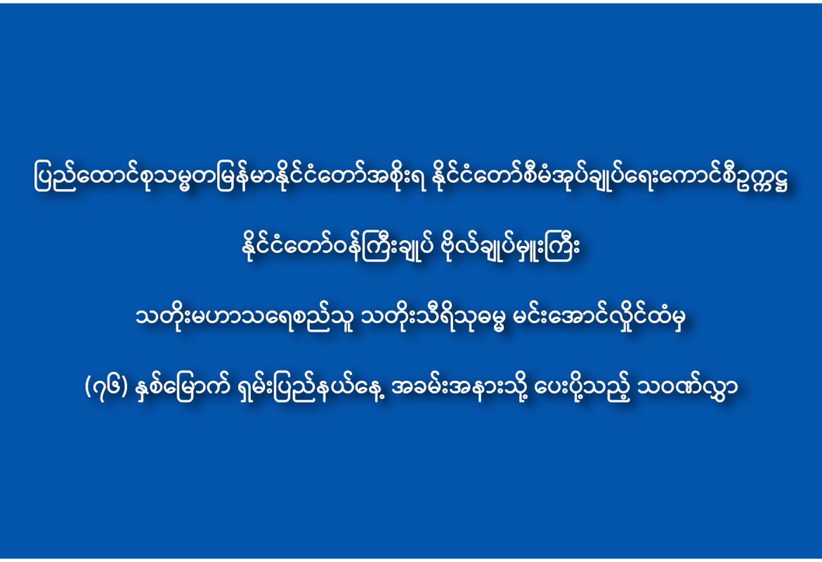 ပြည်ထောင်စုသမ္မတမြန်မာနိုင်ငံတော်အစိုးရ နိုင်ငံတော်စီမံအုပ်ချုပ်ရေးကောင်စီဥက္ကဋ္ဌ နိုင်ငံတော်ဝန်ကြီးချုပ် ဗိုလ်ချုပ်မှူးကြီး သတိုးမဟာသရေစည်သူ သတိုးသီရိသုဓမ္မ မင်းအောင်လှိုင်ထံမှ (၇၆) နှစ်မြောက် ရှမ်းပြည်နယ်နေ့ အခမ်းအနားသို့ ပေးပို့သည့် သဝဏ်လွှာ