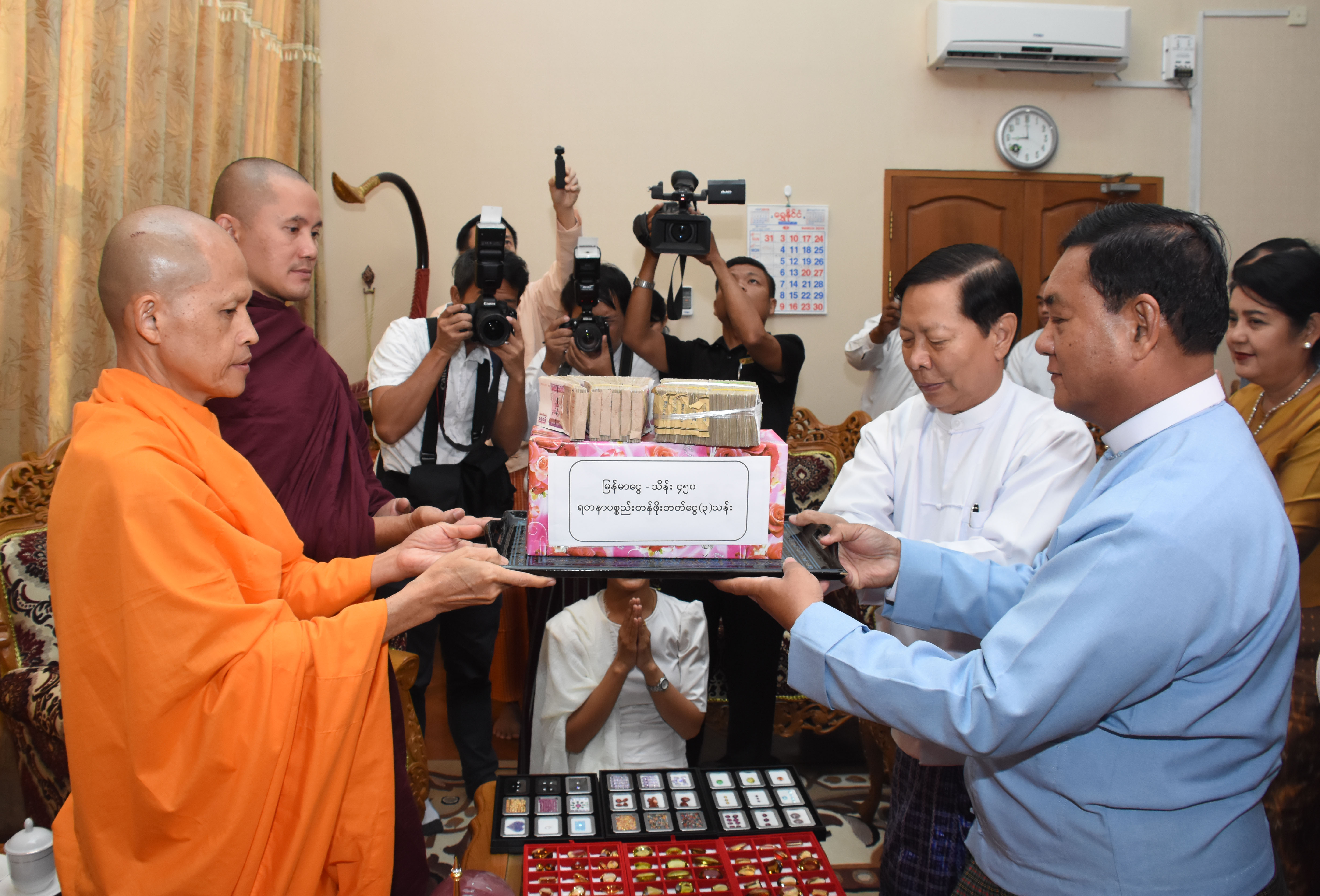 အခမ်းအနားတွင် ထိုင်းနိုင်ငံ ဓမ္မကာယဖောင်ဒေးရှင်းမှ ဆရာတော်ကြီးများက အလှူငွေကျပ်သိန်း ၄၅၀ နှင့် ဌာပနာထည့်သွင်း ပူဇော်နိုင်ရန် ထိုင်းဘတ်ငွေ ၃ သန်းတန်ဖိုးရှိ ရတနာပစ္စည်းများအား လည်းကောင်း၊ အလှူရှင် ဦးလှထွန်း + သီရိသုဓမ္မသိင်္ဂီ ဒေါ်စန်းစန်းဝေ (ရှမ်းပျိုမေ)မိသားစုက အလှူငွေကျပ် ၂၅ သိန်းနှင့် အလှူရှင်ပါမောက္ခ ဒေါက်တာနှင်းနှင်းအေးက အလှူငွေ ၁၀ သိန်းတို့ကို ပေးအပ်လှူဒါန်းရာ သာသနာရေးနှင့် ယဉ်ကျေးမှုဝန်ကြီးဌာန ပြည်ထောင်စုဝန်ကြီး သူရဦးအောင်ကို၊ ဒုတိယဝန်ကြီး ဦးကြည်မင်းတို့က လက်ခံရယူပြီး ပြည်ထောင်စုဝန်ကြီးက သာဓုအနုမောဒနာ ဂုဏ်ပြုမှတ်တမ်းလွှာများ ပြန်လည်ပေးအပ်သည်။