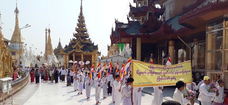 ပြည်ထောင်စုနယ်မြေ နေပြည်တော်ရှိ ထာဝရငြိမ်းချမ်းရေးစေတီတော်၌ တင်လှူပူဇော်မည့် ရတနာစိန်ဖူးတော်၊ ငှက်မြတ်နားတော်နှင့် ရွှေထီးတော်ဘုံအဆင့်ဆင့်များအား ရွှေတိဂုံစေတီတော် ရင်ပြင်ရှိ ချမ်းသာကြီးတန်ဆောင်သို့ ပင့်ဆောင်ပူဇော်သည့် မင်္ဂလာအခမ်းအနားကို ယနေ့ နံနက်ပိုင်းက ကမ္ဘာအေးစေတီတော်အရှေ့ဘက်မုခ် မင်္ဂလာမဏ္ဍပ်၌ ကျင်းပသည်။
