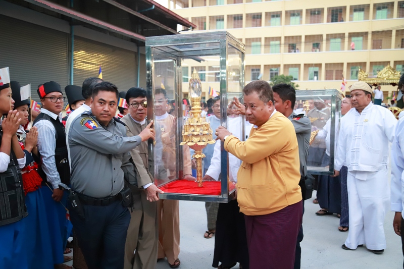ထိုမှတဆင့် ရှမ်းပြည်နယ်မြို့တော် တောင်ကြီးမြို့ ကျောက်တိုင်ကွင်း မိုးလုံလေလုံ အားကစားရုံသို့ ရောက်ရှိရာ ပြည်နယ်ဝန်ကြီးချုပ် ဒေါက်တာလင်းထွဋ်၊ ပြည်နယ်လွှတ်တော်ဥက္ကဋ္ဌ ဦးစိုင်းလုံးဆိုင်၊ ပြည်နယ်တရားလွှတ်တော် တရားသူကြီးချုပ် ဦးကြွယ်ကြွယ်၊ ပြည်နယ်အစိုးရ အဖွဲ့ဝင်ဝန်ကြီးများ၊ ပြည်နယ်၊ ခရိုင်၊ မြို့နယ် ဌာနဆိုင်ရာများ၊ ဒေသခံတိုင်းရင်းသားများ၊ မြို့မိမြို့ဖများ၊ ဘာသာရေး အသင်းအဖွဲ့များ၊ ဂေါပကအဖွဲ့ဝင်များက ဖူးမြော်ကြည်ညိုကြသည်။