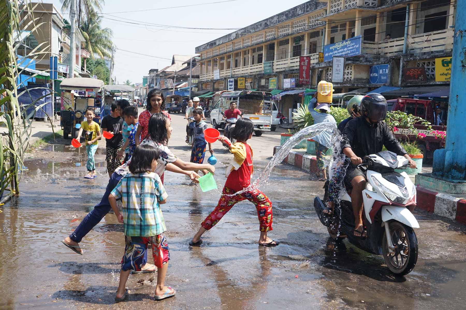 ရပ်ကွက်/ကျေးရွာများအလိုက် ကလေးများ၊ လူငယ်လူရွယ်များသည် အိမ်ရှေ့နှင့် လမ်းနံဘေးများတွင် အုန်းခက်၊ အုန်းလက်များဖြင့် မဏ္ဍပ်များသဖွယ် ဆောက်လုပ်ကြပြီး သင်္ကြန်သီချင်းများဖြင့် ပျှော်ရွှင်စွာ ရေကစားကြသည်။
