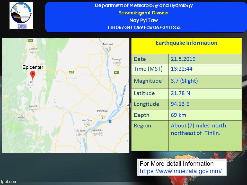 ယနေ့ မြန်မာစံတော်ချိန် မွန်းလွဲ ၁ နာရီ (၂၂)မိနစ်၊ (၄၄)စက္ကန့် အချိန်တွင် ညောင်ဦးမြေငလျင်စခန်းမှ အနောက်မြောက်ဘက် (၆၄) မိုင် ခန့်ကွာဝေးသော (ထီးလင်းမြို့၏ မြောက်-အရှေ့မြောက်ဘက် (၇) မိုင် ခန့်အကွာ) မြောက်လတ္တီတွဒ် (၂၁.၇၈)ဒီဂရီ၊ အရှေ့လောင်ဂျီတွဒ် (၉၄.၁၃) ဒီဂရီ၊ အနက် (၆၉)ကီလိုမီတာကို ဗဟိုပြု၍ အင်အား ရစ်(ခ်)တာစကေး (၃.၇) အဆင့်ရှိ အင်အားအနည်းငယ်ရှိသော မြေငလျင်တစ်ခု လှုပ်ရှားသွားကြောင်း မိုးလေဝသနှင့်ဇလဗေဒညွှန်ကြားမှုဦးစီးဌာနမှ သိရသည်။