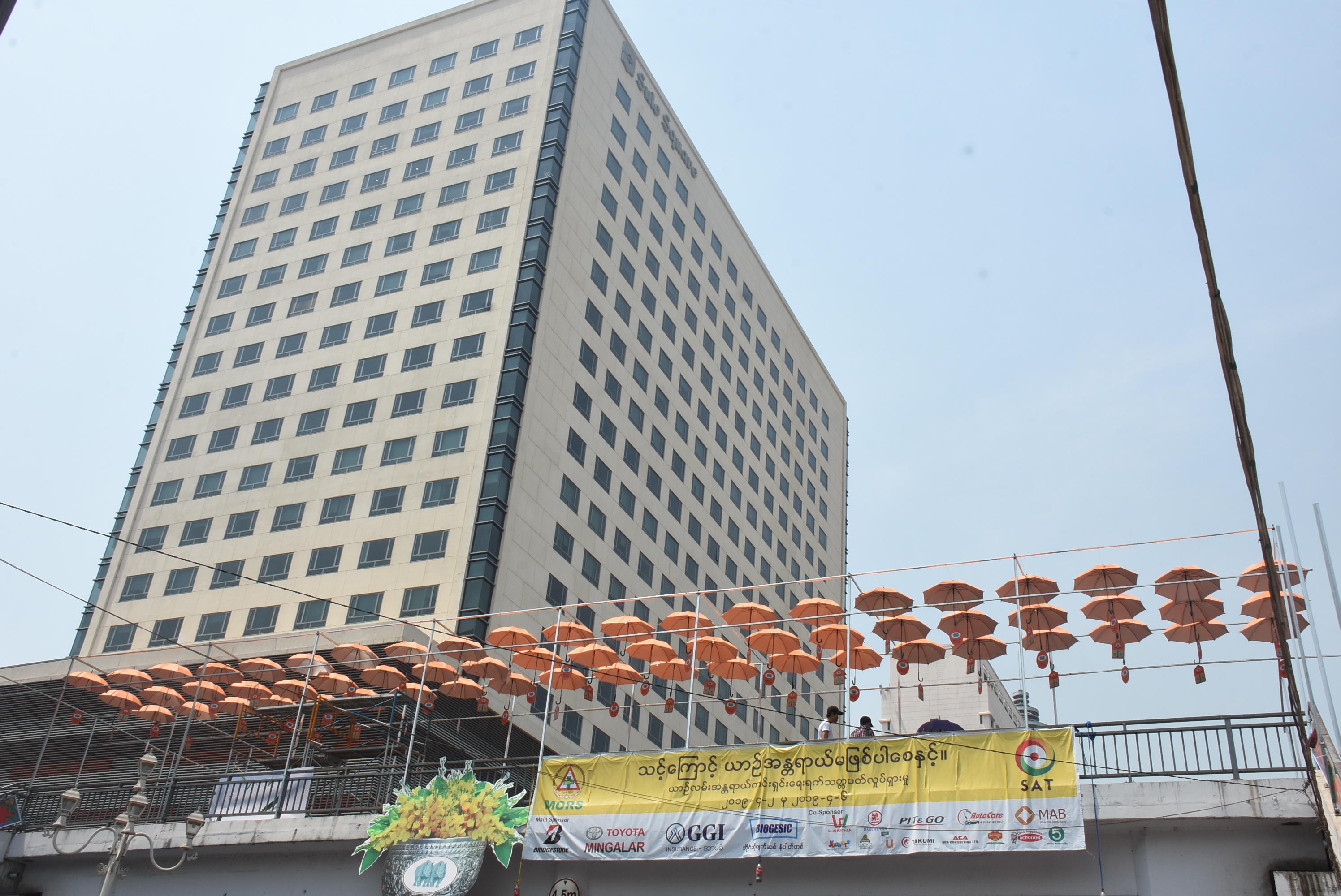 ဆူးလေဘုရားလမ်းနှင့် အနော်ရထာလမ်း လူကူးခုံးကျော်တံတားပေါ်၌ ထီးများဖြင့် ရန်ကုန်သင်္ကြန်အလှကို ဖော်ကျူးထားမှုကို တွေ့ရစဉ်။