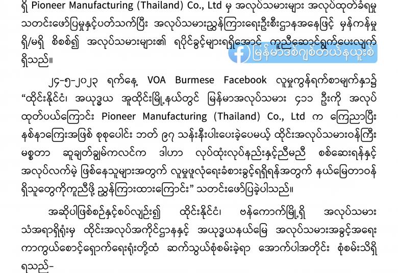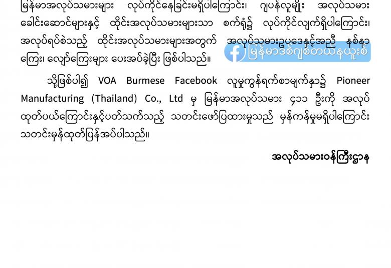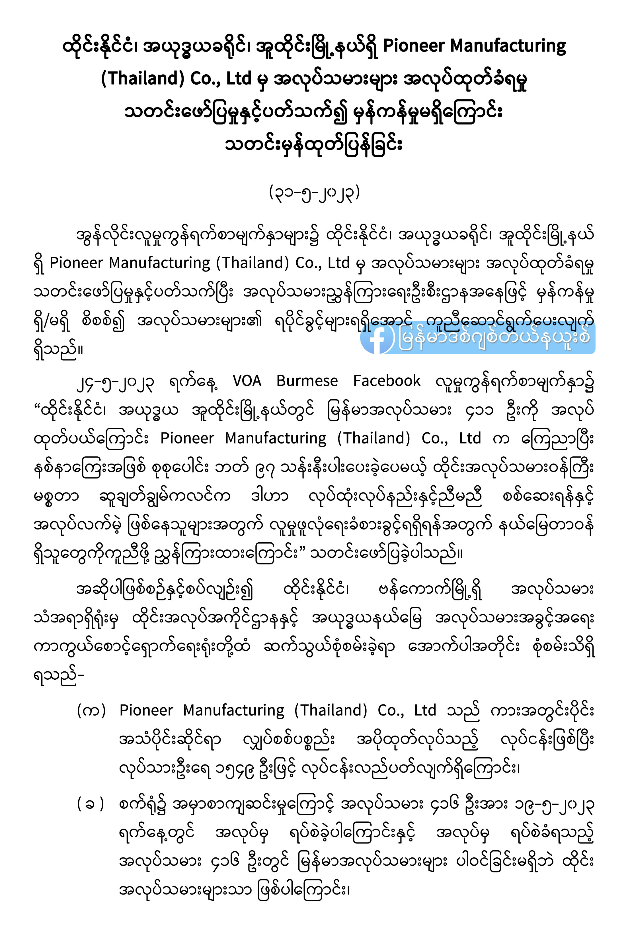 ထိုင်းနိုင်ငံ၊ အယုဒ္ဓယခရိုင်၊ အူထိုင်းမြို့နယ်ရှိ Pioneer Manufacturing (Thailand) Co., Ltd မှ အလုပ်သမားများ အလုပ်ထုတ်ခံရမှု သတင်းဖော်ပြမှုနှင့်ပတ်သက်၍ မှန်ကန်မှုမရှိကြောင်း သတင်းမှန်ထုတ်ပြန်ခြင်း