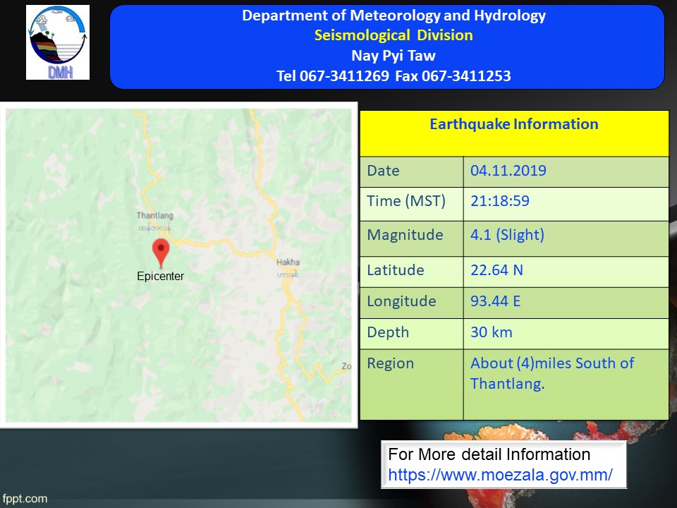 ယနေ့ည မြန်မာစံတော်ချိန် ည ၉ နာရီ ၁၈ မိနစ်အချိန်တွင် ဟားခါးငလျင်စခန်းမှ အနောက်ဘက် (၉)မိုင်ခန့် ကွာဝေးသော မြန်မာနိုင်ငံပြည်တွင်း (ထန်တလန်မြို့၏တောင်ဘက် (၄)မိုင်ခန့်အကွာ) မြောက်လတ္တီတွဒ် ၂၂ ဒသမ ၆၄ ဒီဂရီ၊ အရှေ့လောင်ဂျီတွဒ် ၉၃ ဒသမ ၄၄ ဒီဂရီတွင် အနက် ကီလိုမီတာ ၃၀ ၌ ဗဟိုပြု၍ အင်အား ရစ်(ခ်)တာစကေး ၄ ဒသမ ၁ အဆင့်ရှိ အင်အားအနည်းငယ်ရှိသောမြေငလျင်တစ်ခု လှုပ်ရှားခဲ့မှုအား တိုင်းထွာရရှိခဲ့ကြောင်း မိုးလေဝသနှင့်ဇလဗေဒညွှန်ကြားမှု ဦးစီးဌာနမှ သတင်းထုတ်ပြန်ချက်အရ သိရှိရသည်။