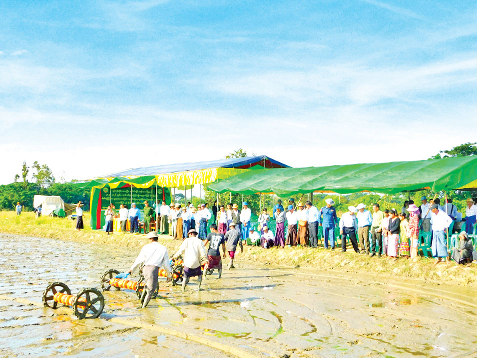 ရန်ကုန်တိုင်းဒေသကြီး ထန်းတပင်မြို့နယ်အတွင်းရှိ ဒေသခံတောင်သူများအား ရေဆင်း စပ်မျိုးနေကြာ(၁)အား မျိုးစေ့ချ စက်ဖြင့် လက်တွေ့စိုက်ပျိုးပြသပေးခြင်းနှင့် မျိုးစေ့ချကိရိယာဖြင့် နွေစပါး လက်တွေ့စိုက်ပျိုးပြသပေးခြင်း အခမ်းအနားကို ယနေ့နံနက်ပိုင်းက ရေဖြူကျေးရွာအုပ်စုရှိ စက်မှုလယ်ယာ စနစ်ကျ လယ်ယာမြေအဖြစ် အကောင်အထည်ဖော် ဆောင်ရွက်ထားသည့် ဧက ၁၅၀ ၌ ကျင်းပသည်။