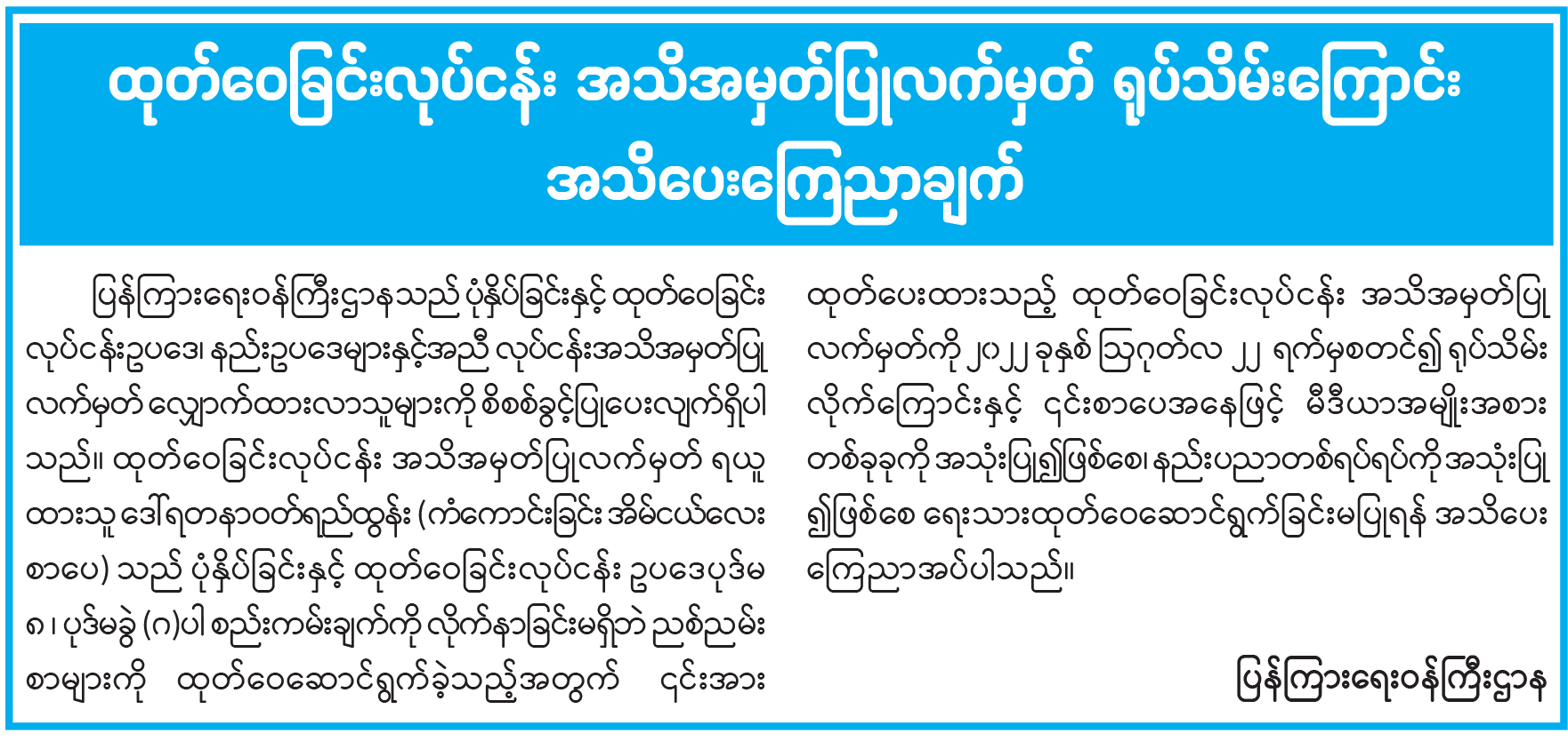 ထုတ်ဝေခြင်းလုပ်ငန်း အသိအမှတ်ပြုလက်မှတ် ရုပ်သိမ်းကြောင်း အသိပေးကြေညာချက်