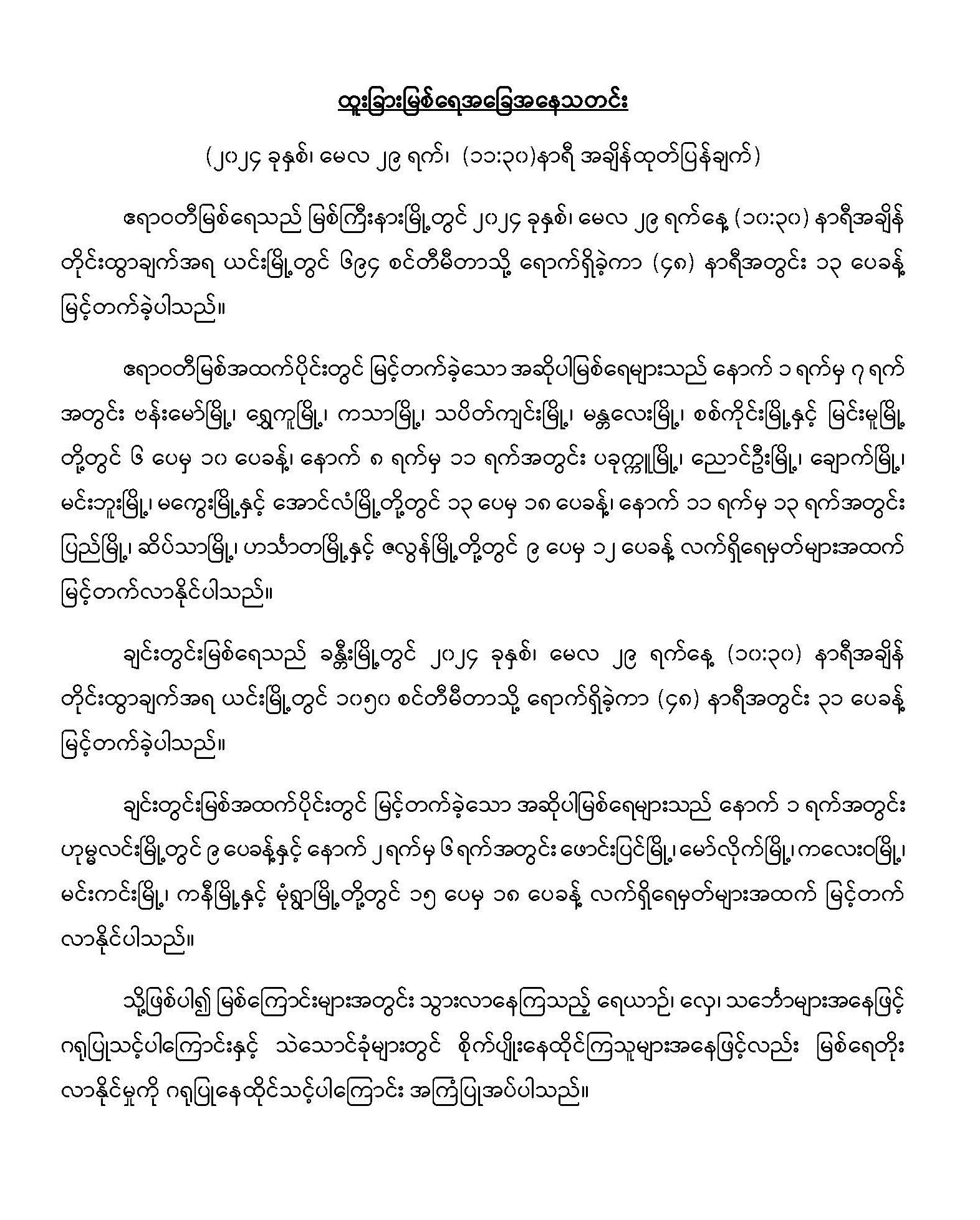 မိုးလေဝသနှင့်ဇလဗေဒညွှန်ကြားမှုဦးစီးဌာနမှ ၂၉-၅-၂၀၂၄ ရက်နေ့တွင် ထူးခြားမြစ်ရေအခြေအနေသတင်းကို ထုတ်ပြန်ထားပါတယ်…