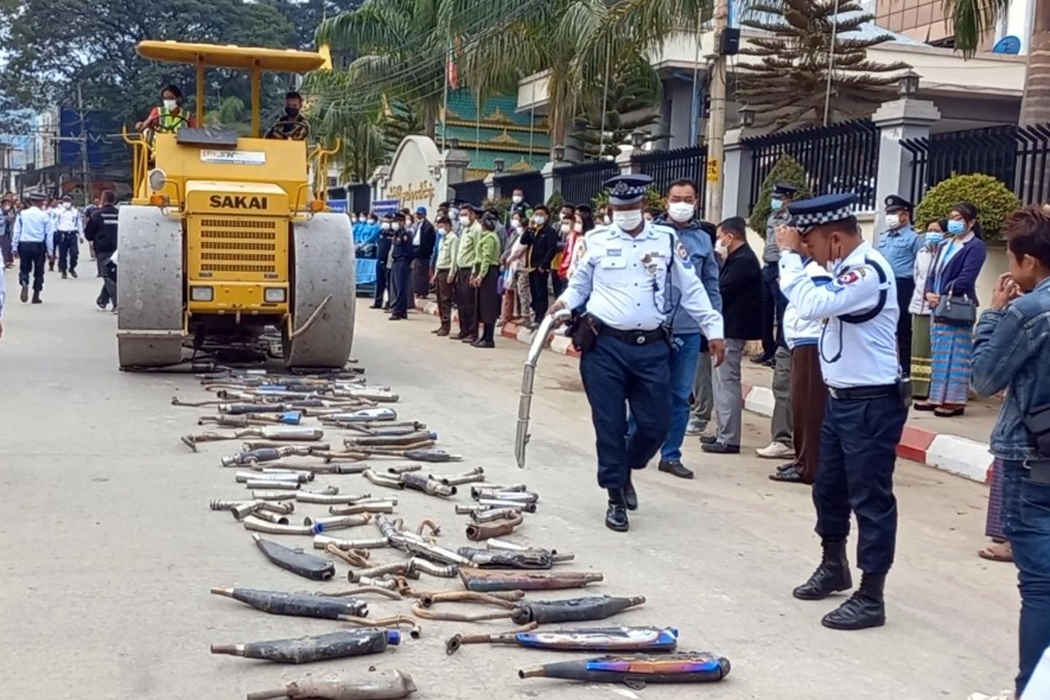 ရှမ်းပြည်နယ် (အရှေ့ပိုင်း)၊ တာချီလိတ်မြို့တွင် စက်သံဆူညံစွာ တပ်ဆင်မောင်းနှင့်သော မော်တော် ဆိုင်ကယ်များမှ သိမ်းဆည်းထိန်းသိမ်းထားရှိသည့် ပါဝါအိတ်ဇောများ ဖျက်ဆီးခြင်းကို ခရိုင် ယာဉ်စည်းကမ်း ထိန်းသိမ်းရေးကြီးကြပ်မှုကော်မတီက ဒီဇင်ဘာ ၂၄ ရက် နံနက်ပိုင်းက ခရိုင်စုပေါင်းရုံးရှေ့၊ ဗိုလ်ချုပ် လမ်းမပေါ်၌ ပြုလုပ်ခဲ့သည်။
