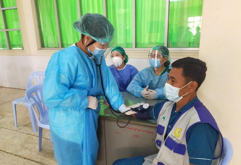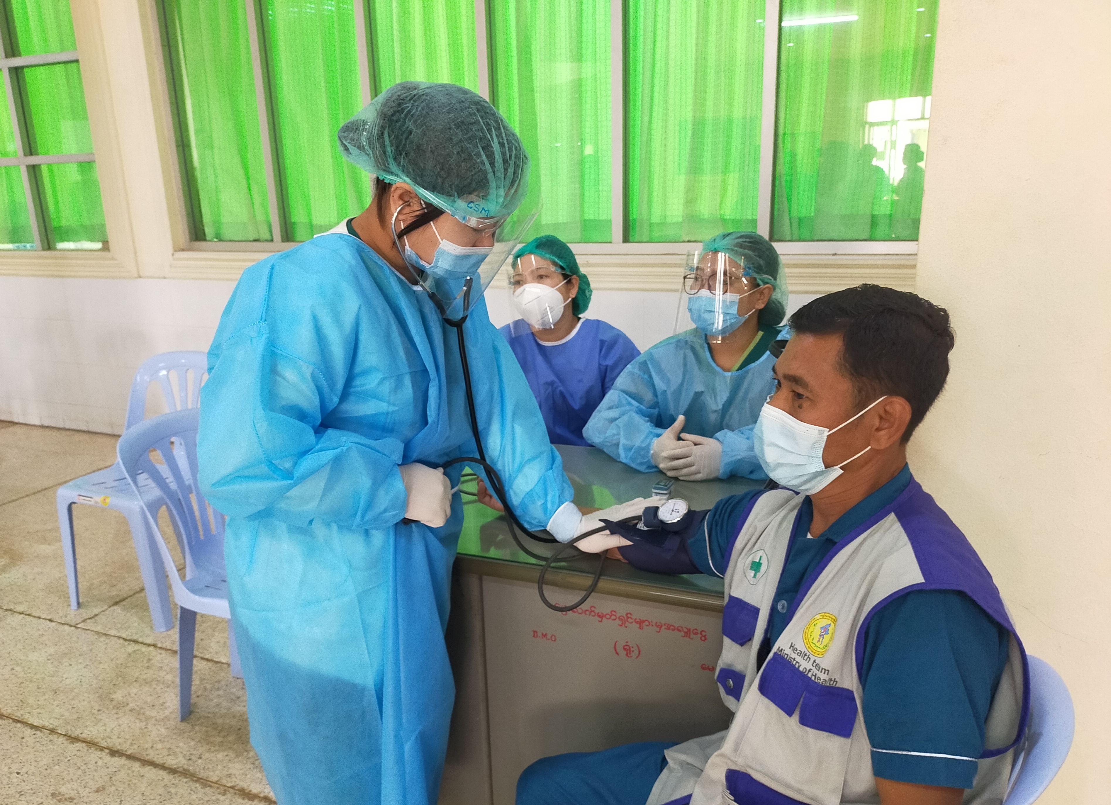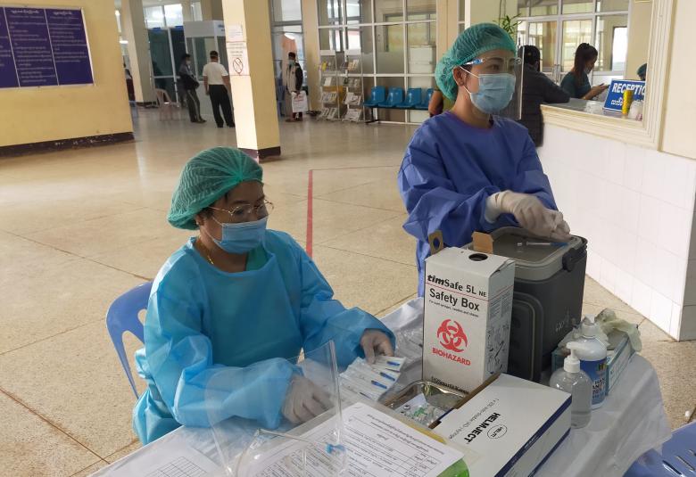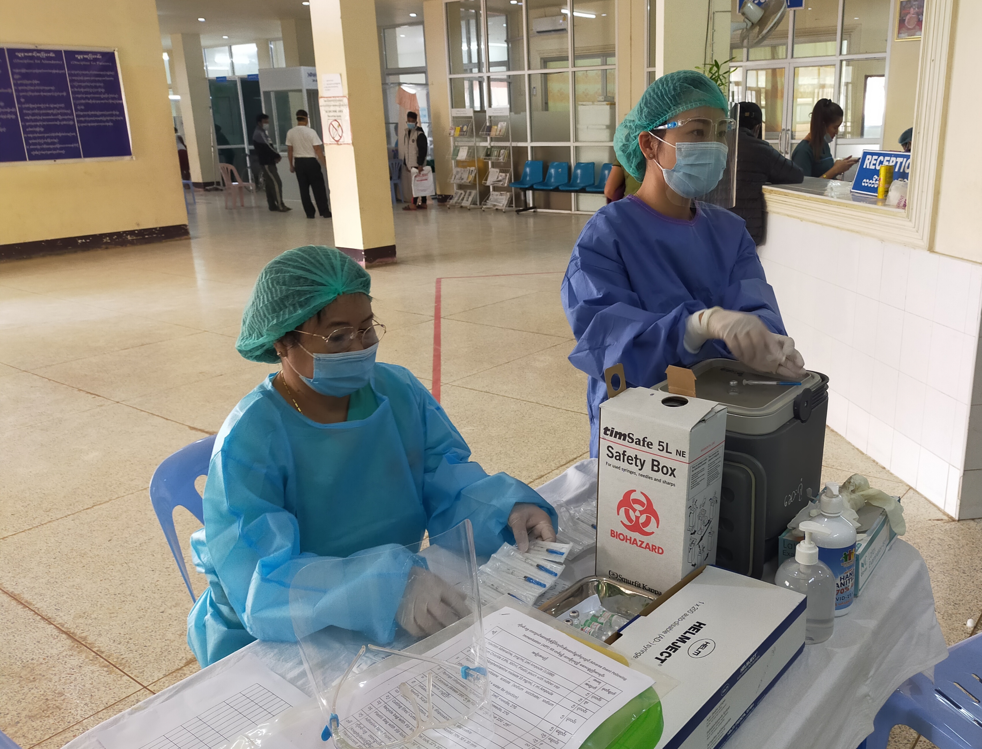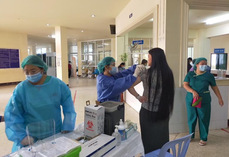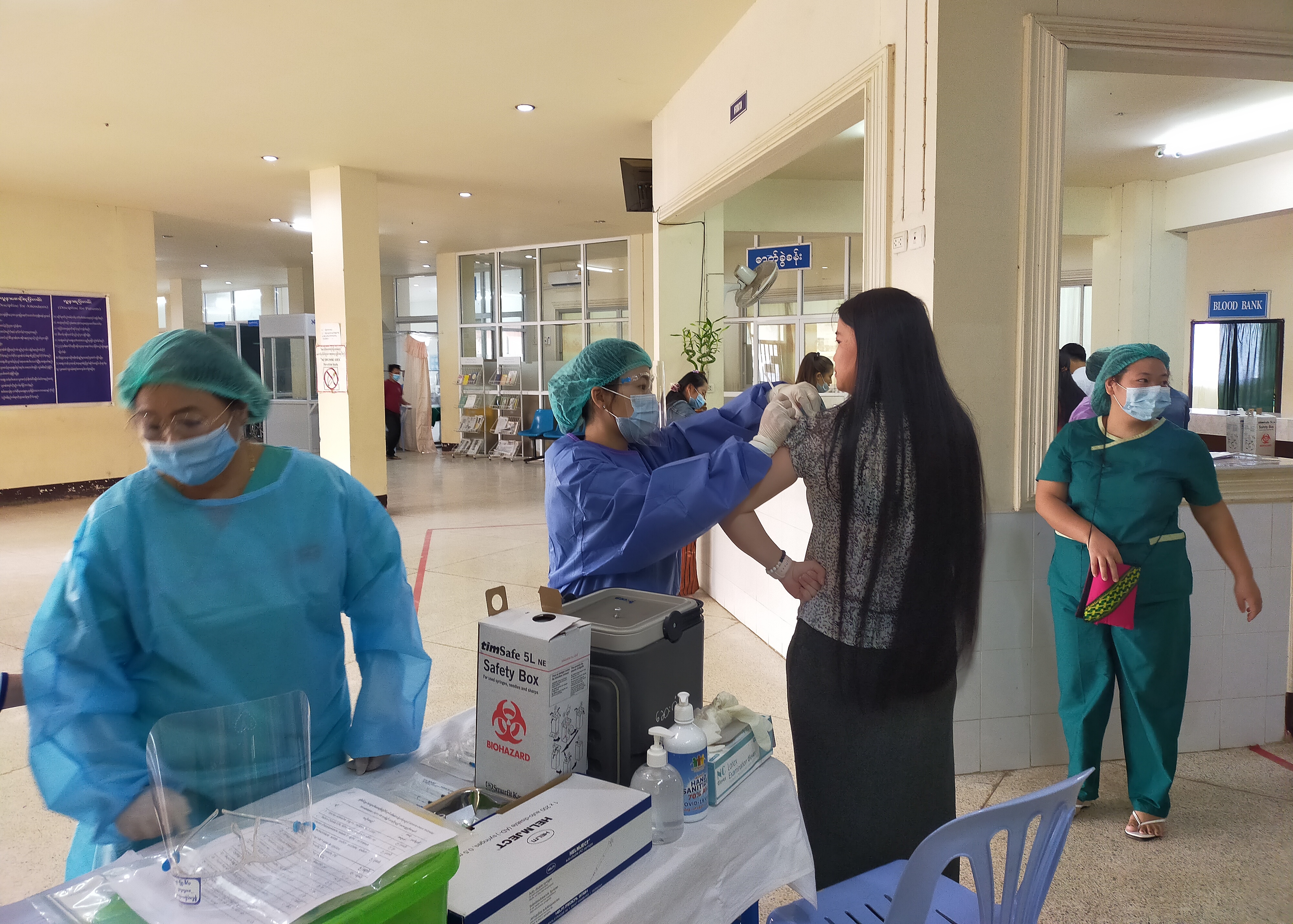 မြန်မာ-ထိုင်းနယ်စပ်ဒေသ ရှမ်းပြည်နယ်(အရှေ့ပိုင်း)တာချီလိတ်မြို့တွင် Covid-19 ကာကွယ်ဆေးကို ကျန်းမာရေးဝန်ထမ်းများအား ယနေ့ နံနက်ပိုင်းက ခရိုင်ပြည်သူ့ဆေးရုံ၌ ထိုးနှံပေးလျက်ရှိသည်။