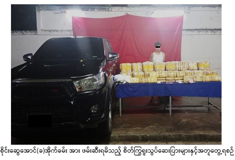 မူးယစ်ဆေးဝါး တားဆီးနှိမ်နင်းရေးရဲတပ်ဖွဲ့မှ တပ်ဖွဲ့ဝင်များနှင့် လုံခြုံရေးတပ်ဖွဲ့ဝင်များပါဝင်သော ပူးပေါင်းအဖွဲ့ သည် အောက်တိုဘာ ၅ ရက် ည ၆ နာရီ မိနစ် ၅၀ က သတင်းအရ တာချီလိတ်မြို့၊ ရန်အောင်မြေရပ်ကွက်၊ ပါလျှံ(၃)၊ ဗိုလ်ချုပ်လမ်းမပေါ်တွင် စိုင်းဆွေအောင် (ခ)အိုက်ခမ်း မောင်းနှင်လာသော Toyota Hilux Revo အမျိုးအစား မော်တော်ယာဉ်ကို ရပ်တန့်ရှာဖွေရာ စိတ်ကြွရူးသွပ်ဆေးပြား ၁,၆၉၈,၀၀၀ သိမ်းဆည်းရမိခဲ့ကြောင်း။