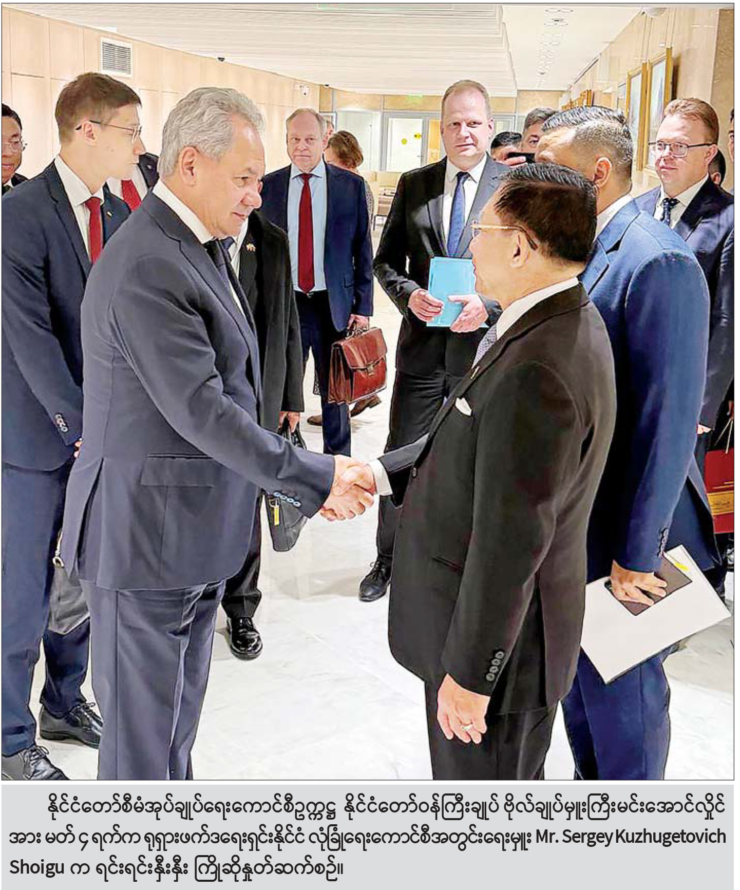 လုံခြုံရေးကောင်စီအတွင်းရေးမှူးနှင့် အဖွဲ့ဝင်များက ရင်းနှီးနွေးထွေးစွာ ဆီးကြိုနှုတ်ဆက်၍ ခန်းမအတွင်းသို့ ဦးဆောင်ခေါ်ယူသည်။ ဆွေးနွေးပွဲစတင်သည်နှင့် နှစ်နိုင်ငံဆက်ဆံရေး တိုးတက် ကောင်းမွန်လျက်ရှိမှု အခြေအနေများကို မင်္ဂလာရှိစွာ စတင်ဆွေးနွေးသည်။ သည့်နောက်တွင် လုံခြုံရေးဆိုင်ရာကိစ္စရပ်များ ပူးပေါင်းဆောင်ရွက်ခြင်းနှင့် ပိုမိုမြှင့်တင်ဆောင်ရွက်ရေးဆိုင်ရာ ကိစ္စရပ်များကိုဆက်လက်ဆွေးနွေးကြသည်။ မိမိတို့နိုင်ငံတွင် မကြာမီကာလအတွင်း နှစ် (၈၀) ပြည့် တပ်မတော်နေ့ကို ဆင်ယင်ကျင်းပတော့မည့်နည်းတူ ရုရှားနိုင်ငံ၌လည်း နှစ်(၈၀) ပြည့် ဖက်ဆစ်တော်လှန်ရေးနေ့ ကျင်းပတော့မည်ဖြစ်သည်။ လုံခြုံရေးကောင်စီအတွင်းရေးမှူးက ထိုအခမ်းအနားကြီးသို့ မြန်မာကိုယ်စားလှယ်များ တက်ရောက်ရေးနှင့် အခြားသော လုံခြုံရေးဖိုရမ်များ၌လည်း မြန်မာကိုယ်စားလှယ်များ ဖိတ်ခေါ်ခြင်းဆိုင်ရာအကြောင်း ကိစ္စများကို ပြန်လည်ဆွေးနွေးခဲ့သည်။ ၂၀၂၄ ခုနှစ်အတွင်းက ကျင်းပပြီးစီးခဲ့သည့် (၁၂) ကြိမ်မြောက် လုံခြုံရေးကိစ္စရပ်များဆိုင်ရာ အဆင့်မြင့်အရာရှိကြီးများ အစည်းအဝေးသို့လည်း မြန်မာနိုင်ငံမှ ကိုယ်စားလှယ်အဖွဲ့ တက်ရောက်ခဲ့ပြီး ဖြစ်သည်။