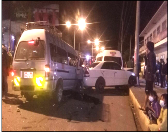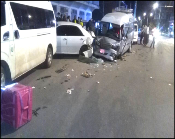 ရှမ်းပြည်နယ်၊ တောင်ကြီးမြို့၌ နိုဝင်ဘာ ၂၅ ရက် ည ၉ နာရီ ၁၅ မိနစ်က မော်တော်ယာဉ် လေးစီးနှင့် ဆိုင်ကယ် တစ်စီး တိုက်မိခဲ့ပြီး ၅ ဦးဒဏ်ရာရရှိခဲ့ကြောင်း သိရသည်။