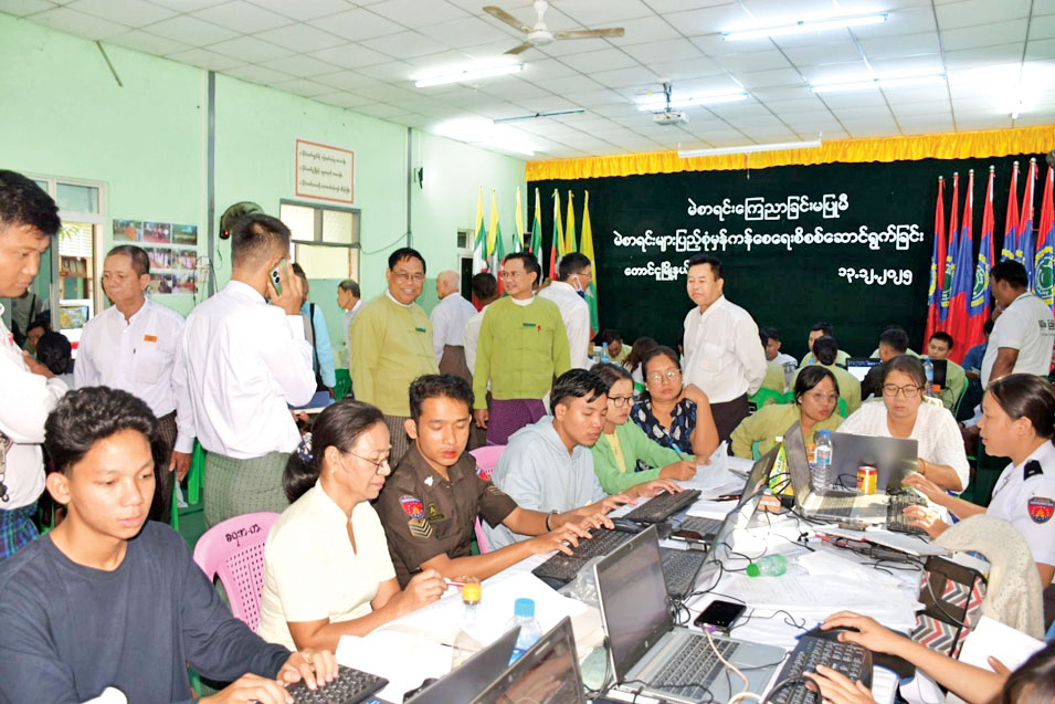 ပဲခူးတိုင်းဒေသကြီး တောင်ငူခရိုင်အတွင်း တတိယအကြိမ် မဲဆန္ဒရှင်စာရင်းများ ကြေညာခြင်း မပြုမီ ပြည့်စုံမှန်ကန်စေရေးအတွက် ခရိုင်စီမံခန့်ခွဲရေးနှင့် အုပ်ချုပ်ရေးကော်မတီ ဥက္ကဋ္ဌ ဦးစောထွန်းဦးနှင့် အဖွဲ့ဝင်များ ဦးဆောင်၍ မဲဆန္ဒရှင်စာရင်းများ စိစစ်စစ်ဆေး ဆောင်ရွက်ခြင်းကို ဒီဇင်ဘာ ၁၃ ရက် မွန်းလွဲပိုင်းက ခရိုင်အထွေထွေအုပ်ချုပ်ရေး ဦးစီးဌာနဝင်းအတွင်းရှိ နတ်သျှင်နောင် ခန်းမနှင့် ပြည်သူ့ဝန်ဆောင်မှုရုံးတို့၌ ဆောင်ရွက်သည်။