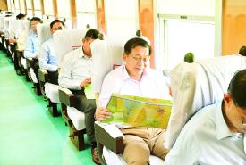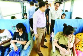 ဆက်လက်၍ နိုင်ငံတော်လုံခြုံရေးနှင့် အေးချမ်းသာယာရေးကော်မရှင်ဥက္ကဋ္ဌနှင့် ဇနီးဒေါ်ကြူကြူလှ၊ ခရီးစဉ်တွင်လိုက်ပါလာကြသည့် အဖွဲ့ဝင်များသည် နေပြည်တော်မှ ထွက်ခွာလာသည့် နေပြည်တော်-ရန်ကုန် အမှတ် (၈) အစုန် DEMU လူစီးအမြန်ရထားပေါ်တွင် စီးနင်းလိုက်ပါလာသည့် ခရီးသွားပြည်သူများနှင့်အတူ တောင်ငူဘူတာမှ ရန်ကုန်ဘူတာကြီးအထိ ရထားလမ်းပိုင်းတစ်လျှောက် လိုက်ပါစီးနင်းသည်။