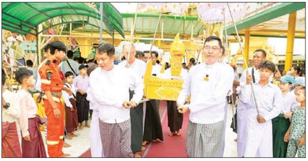 ဦးစွာ နယ်မြေခံတပ်နယ်မှ ဗိုလ်မှူးချုပ် စွမ်းလှိုင်မင်း၊ ခရိုင်စီမံအုပ်ချုပ်ရေးအဖွဲ့ အဖွဲ့ဝင် ဒုတိယဗိုလ်မှူးကြီး ကျော်ကျော်အောင်၊ ခရိုင်စီမံ အုပ်ချုပ်ရေးအဖွဲ့ အဖွဲ့ဝင် ဦးယဉ်ဌေး၊ ခရိုင် တရားသူကြီး ဦးမိုးကြည်မောင်၊ မြို့နယ်စီမံအုပ်ချုပ် ရေးအဖွဲ့ဥက္ကဋ္ဌ ဦးဉာဏ်လင်းအောင်၊ မြို့မိမြို့ဖများ၊ ရွှေဆံတော်စေတီတော်မြတ်ကြီး ဂေါပကအဖွဲ့ဝင်များနှင့် ဒေသခံပြည်သူများက မရမ်းကျောင်းစာသင်တိုက် ဆရာတော်အဂ္ဂမဟာပဏ္ဍိတ ဘဒ္ဒန္တတေဇောသာရ ထံမှ ကိုးပါးသီလ ခံယူဆောက်တည်သည်။ ထို့နောက် တာဝန်ရှိသူများသည် အလှူရှင် CB ဘဏ် မိသားစုမှ ပြန်လည်လှူဒါန်းထားသော ရွှေဆံတော်စေတီတော်မြတ်ကြီး၏ အထွတ်မှ စိန်ဖူးတော်နှင့် ငှက်မြတ် နားတော်တို့အား ရင်ပြင်တော်ပေါ်သို့ ပင့်ဆောင်၍ ဝင်းခင်းပြီး ဝေါယာဉ်ဖြင့် ရွှေဆံတော်စေတီတော် မြတ်ကြီးအား လက်ယာရစ်တစ်ပတ် ပတ်ကာ ဂန္ထဝင် ကိုးခန်းသိမ်တော် ယာယီစံကျောင်းတော်သို့ ပင့်ဆောင်ပူဇော်ထားရှိသည်။