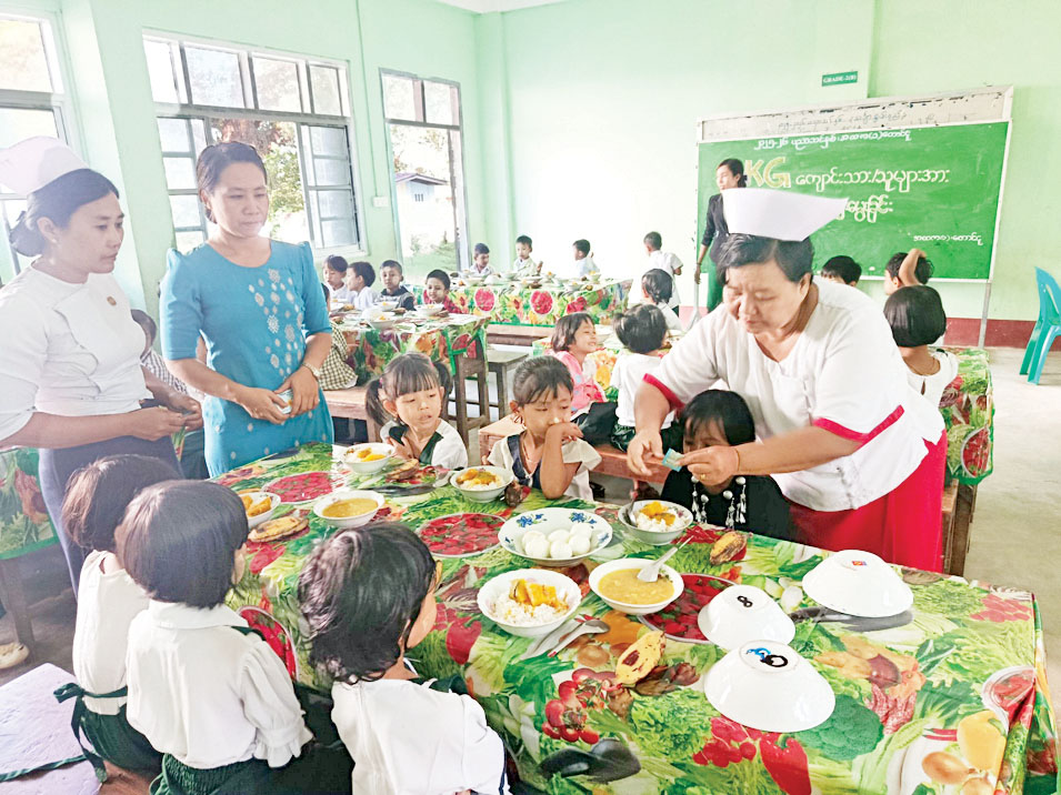 ထိုသို့ဆောင်ရွက်ရာတွင် တောင်ငူခရိုင် ပြည်သူ့ကျန်းမာရေးဦးစီးဌာနမှူး ဒေါက်တာမီမီခင် ဦးဆောင်၍ ကျောင်းတွင်းအာဟာရကျွေးမွေးခြင်းအစီအစဉ်ကို အဆိုပါကျောင်းရှိ KG ကျောင်းသား ကျောင်းသူ ၃၈ ဦးအား အဏုအာဟာရမှုန့်များ ထည့်သွင်းကျွေးမွေးခြင်း၊ ကျန်းမာရေး ပညာပေးခြင်း၊ ကျန်းမာရေးစောင့်ရှောက်မှုလုပ်ငန်းများ ဆောင်ရွက်ခြင်းတို့ကို တောင်ငူမြို့နယ် မိခင်ကလေးကျန်းမာရေးဌာနမှ ကျန်းမာရေး ဝန်ထမ်းများနှင့် ပူးပေါင်း၍ ဆောင်ရွက်ခဲ့ကြောင်း သိရသည်။