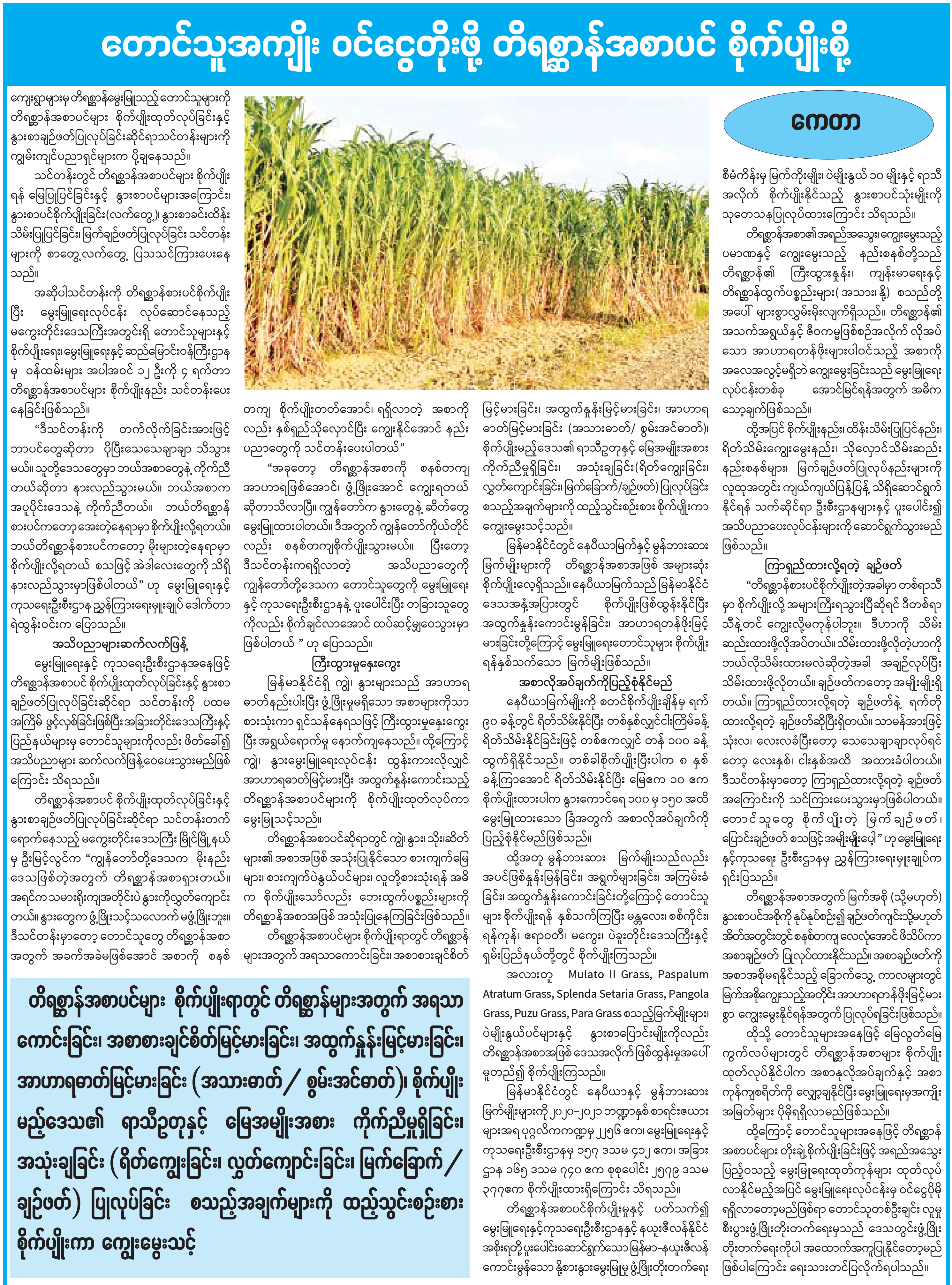 တောင်သူအကျိုး ဝင်ငွေတိုးဖို့ တိရစ္ဆာန်အစာပင်စိုက်ပျိုးစို့