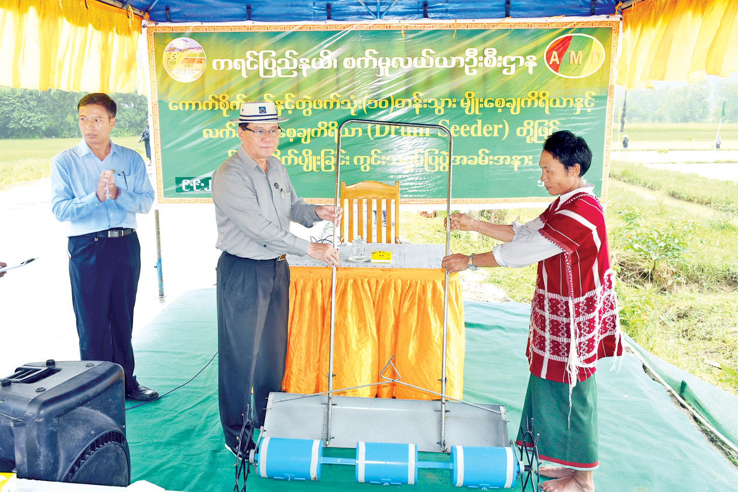 ဦးစွာ ကရင်ပြည်နယ်ဝန်ကြီးချုပ် ဦးစောမြင့်ဦးက အမှာစကားပြောကြားပြီး စက်မှုလယ်ယာဦးစီးဌာန ပြည်နယ်ဦးစီးမှူးက မျိုးစေ့ချကိရိယာများ အသုံးပြုပုံနှင့် အကျိုးကျေးဇူးများကို ရှင်းလင်း ပြောကြားသည်။ ဆက်လက်၍ ပြည်နယ်ဝန်ကြီးချုပ်၊ ပြည်နယ်တရားလွှတ်တော် တရားသူကြီးချုပ်၊ ပြည်နယ်ဝန်ကြီးများက ရဲသာ(ကမော့ကစင်)၊ တော်ပုံ၊ လှိုင်ကမ္ဘာ၊ တရုတ်လှ၊ လှာကဒေါင်ကျေးရွာ တို့မှ တောင်သူများအတွက် လက်ဆွဲမျိုးစေ့ချ ကိရိယာများ အခမဲ့ပေးအပ်ကြသည်။