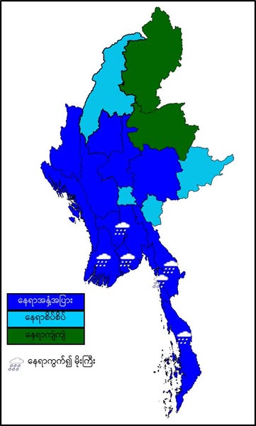 နောက် ၂ ရက်အတွက်ခန့်မှန်းချက်။ ရန်ကုန်တိုင်းဒေသကြီး၊ ပဲခူးတိုင်းဒေသကြီး၊ ဧရာဝတီတိုင်းဒေသကြီး၊ တနင်္သာရီတိုင်းဒေသကြီး၊ ကရင်ပြည်နယ်နှင့် မွန်ပြည်နယ်တို့တွင် မိုးပိုလာမည်။