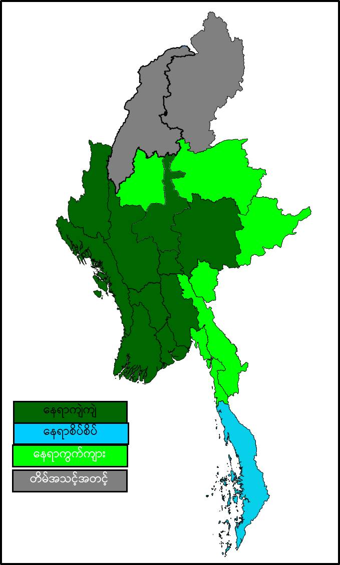 မနက်ဖြန်နံနက်အထိခန့်မှန်းချက်။ စစ်ကိုင်းတိုင်းဒေသကြီးအထက်ပိုင်းနှင့် ကချင်ပြည်နယ်တို့တွင် တိမ်အသင့်အတင့် ဖြစ်ထွန်းမည်။ တနင်္သာရီတိုင်းဒေသကြီးတွင် နေရာစိပ်စိပ်၊ နေပြည်တော်၊ မန္တလေးတိုင်းဒေသကြီး၊ မကွေးတိုင်းဒေသကြီး၊ ပဲခူးတိုင်းဒေသကြီး၊ ရန်ကုန်တိုင်းဒေသကြီး၊ ဧရာဝတီတိုင်းဒေသကြီး၊ ရှမ်းပြည်နယ် (တောင်ပိုင်း)၊ ချင်းပြည်နယ်နှင့် ရခိုင်ပြည်နယ်တို့တွင် နေရာကျဲကျဲနှင့် ကျန်တိုင်းဒေသကြီးနှင့် ပြည်နယ်တို့တွင် နေရာကွက်ကျား မိုးထစ်ချုန်းရွာမည်။ ရွာရန်ရာနှုန်းပြည့် ဖြစ်ပါသည်။