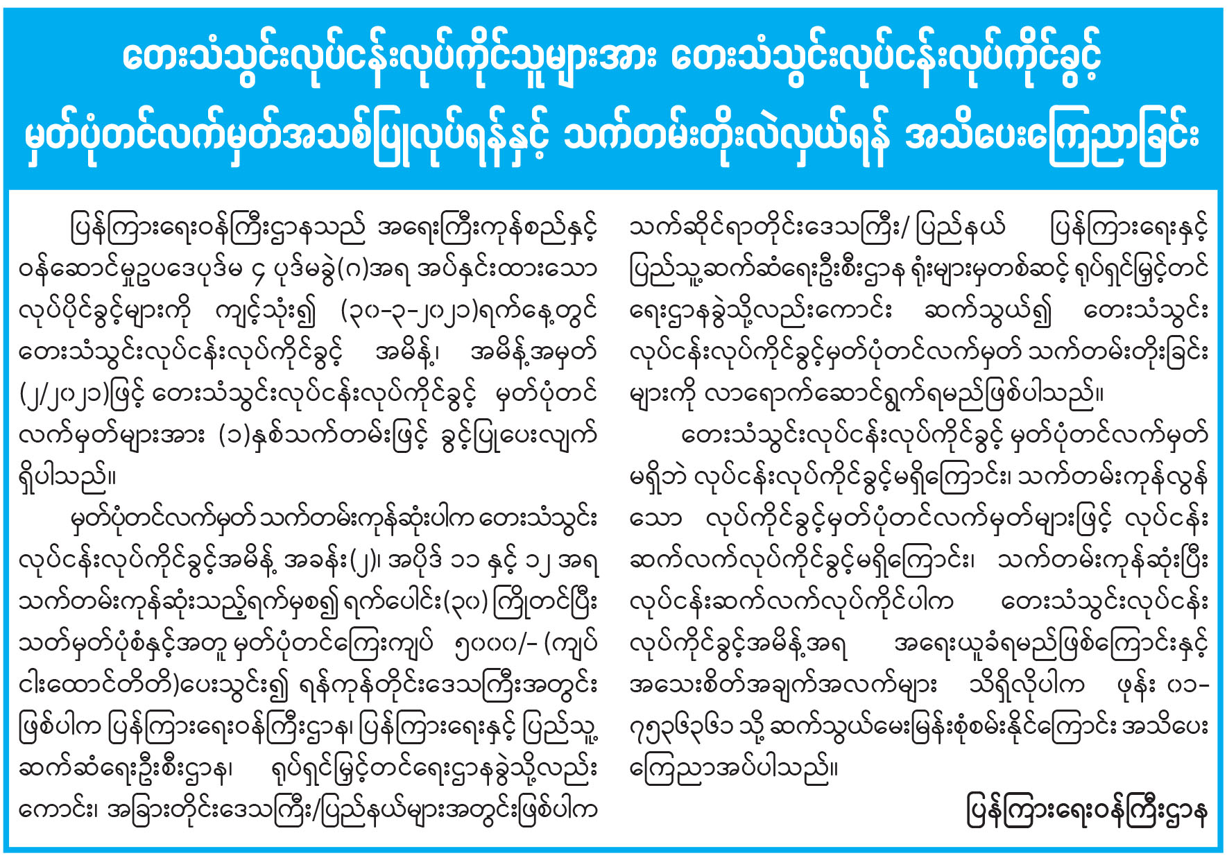 တေးသံသွင်းလုပ်ငန်းလုပ်ကိုင်သူများအား တေးသံသွင်းလုပ်ငန်းလုပ်ကိုင်ခွင့် မှတ်ပုံတင်လက်မှတ် အသစ်ပြုလုပ်ရန်နှင့် သက်တမ်းတိုးလဲလှယ်ရန် အသိပေးကြေညာခြင်း