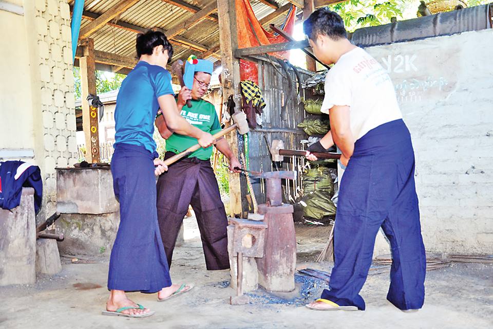 "ကျွန်တော်တို့ တိုင်းဆာ(မိုင်းသာရှမ်း)လူမျိုးတွေရဲ့ ရိုးရာလက်မှုပညာဖြစ်တဲ့ ပန်းပဲ ထုတဲ့ လုပ်ငန်းဟာ ဟိုးရှေးဘိုးစဉ်ဘောင်ဆက် ကာလကတည်းက လုပ်ကိုင်ခဲ့ကြတာပါ။ ကျွန်တော်တို့ထုလုပ်တဲ့ ပန်းပဲပစ္စည်းတွေ ကတော့ လွယ်ဓားရှည်၊ တောင်ယာခုတ်ဓား၊ လယ်ယာသုံးတံစဉ်၊ မီးဖိုချောင်သုံး ဟင်းသီး ဟင်းရွက်နဲ့ အသားငါးလှီးဓား အရွယ်အစား အမျိုးမျိုးတွေကိုထုတ်လုပ်ပါတယ်။ ပြီးတော့ ထင်းခွေ၊ ထင်းခုတ်ဓားမတွေလည်း ထုလုပ် ကြပါတယ်"ဟု ပန်းပဲထုလုပ်မှုပစ္စည်း အမျိုး အစားများနှင့်ပတ်သက်၍ ဦးရွှေဘော်က ပြောကြားသည်။