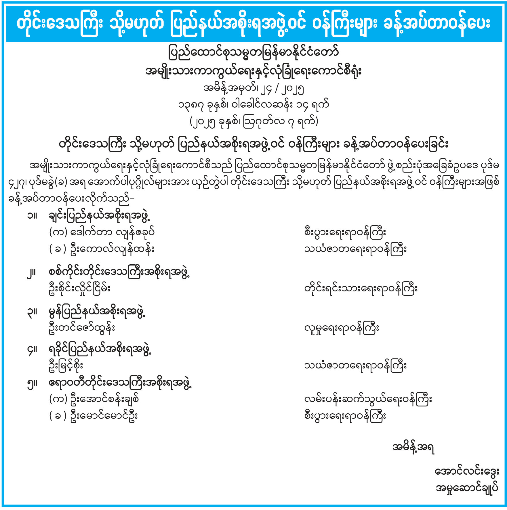 တိုင်းဒေသကြီး သို့မဟုတ် ပြည်နယ်အစိုးရအဖွဲ့ဝင် ဝန်ကြီးများ ခန့်အပ်တာဝန်ပေး