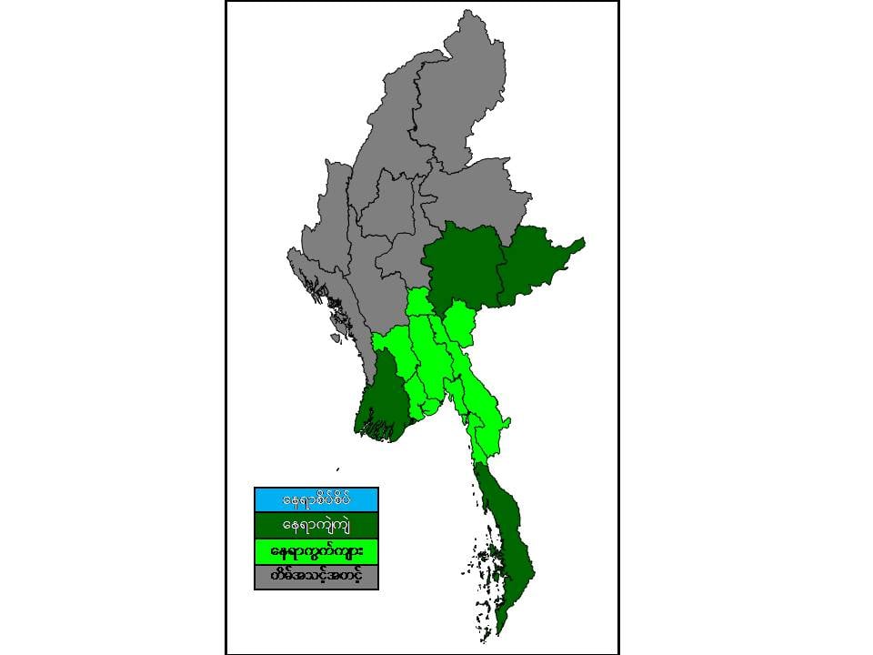 လွန်ခဲ့သော(၂၄)နာရီအတွင်းက တနင်္သာရီတိုင်းဒေသကြီး၊ ရှမ်းပြည်နယ် (တောင်ပိုင်း)နှင့် ကယားပြည်နယ်တို့တွင် နေရာကျဲကျဲနှင့် ဧရာဝတီတိုင်းဒေသကြီး၊ ရှမ်းပြည်နယ်(အရှေ့ပိုင်း)၊ ကရင်ပြည်နယ်နှင့် မွန်ပြည်နယ် တို့တွင် နေရာကွက်ကျား မိုးထစ်ချုန်းရွာခဲ့ပြီး ကျန်တိုင်းဒေသကြီးနှင့် ပြည်နယ်တို့တွင် တိမ်အသင့်အတင့် ဖြစ်ထွန်းခဲ့သည်။