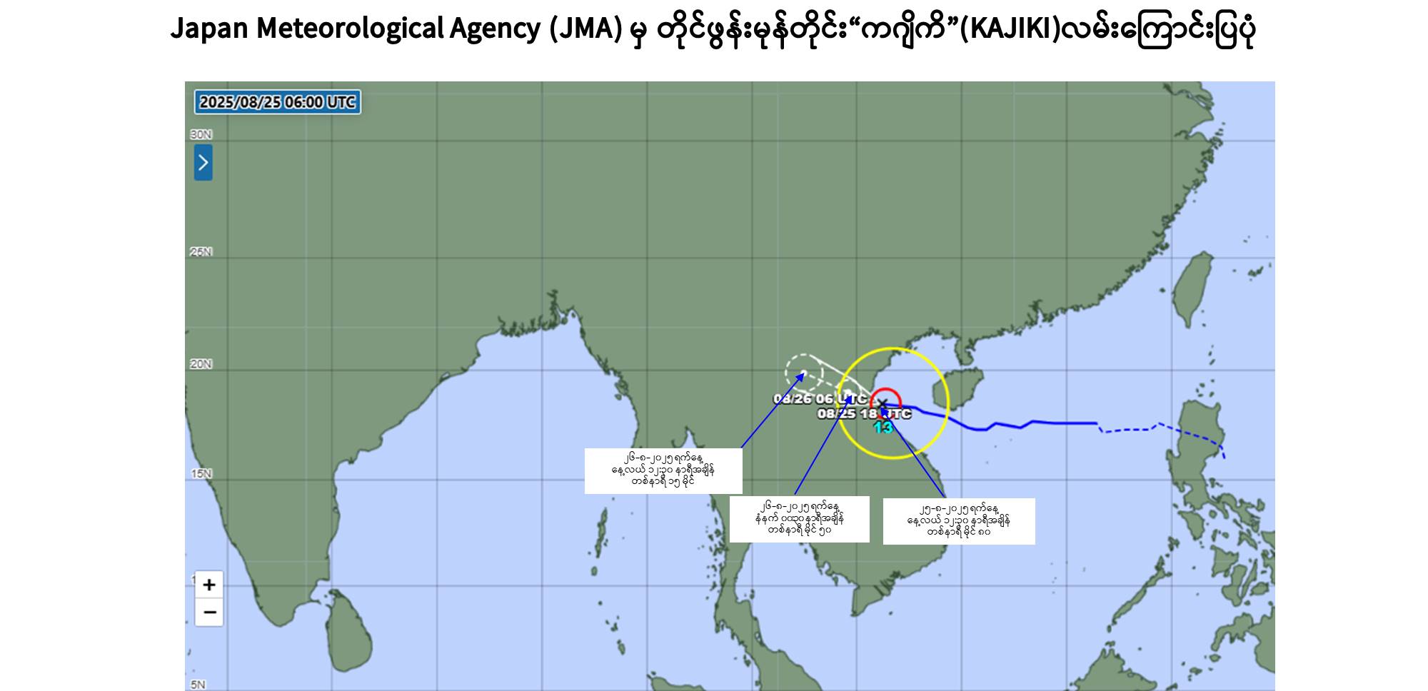 အဆိုပါ တိုင်ဖွန်းမုန်တိုင်း “ကဂျိကိ”၏ အရှိန်ကြောင့် ယနေ့ နေ့လယ်မှ ၂၉-၈-၂၀၂၅ ရက်နေ့အတွင်း နေပြည်တော်၊ ရန်ကုန်တိုင်းဒေသကြီး၊ မန္တလေးတိုင်းဒေသကြီး၊ ပဲခူးတိုင်းဒေသကြီး၊ မကွေးတိုင်းဒေသကြီး၊ စစ်ကိုင်းတိုင်းဒေသကြီး၊ ဧရာဝတီတိုင်းဒေသကြီး၊ တနင်္သာရီတိုင်းဒေသကြီး၊ ကချင်ပြည်နယ်၊ ကယားပြည်နယ်၊ ကရင်ပြည်နယ်၊ ချင်းပြည်နယ်၊ မွန်ပြည်နယ်၊ ရခိုင်ပြည်နယ်နှင့် ရှမ်းပြည်နယ်တို့တွင် နေရာစိပ်စိပ်မှ နေရာအနှံ့အပြား မိုးထစ်ချုန်းရွာပြီး၊ အချို့ဒေသများတွင် ဒေသအလိုက်နှင့် နေရာကွက်၍ မိုးကြီးနိုင်ပါသည်။ မြန်မာ့ကမ်းရိုးတန်းတစ်လျှောက်နှင့် ကမ်းလွန်ပင်လယ်ပြင်တို့တွင် ရံဖန်ရံခါ မိုးသက်လေပြင်းများကျရောက်ပြီး လှိုင်းကြီးမည်။ မိုးသက်လေပြင်းကျစဉ် ရေပြင်/ မြေပြင်လေသည် တစ်နာရီလျှင် ၃၅ မိုင်အထိ တိုက်ခတ်နိုင်ပါသည်။ လှိုင်းအမြင့်မှာ မြန်မာ့ကမ်းရိုးတန်းတစ်လျှောက်နှင့် ကမ်းလွန်ပင်လယ်ပြင်တို့တွင် ၁၀ ပေမှ ၁၂ ပေခန့် ရှိနိုင်ပါသည်။”