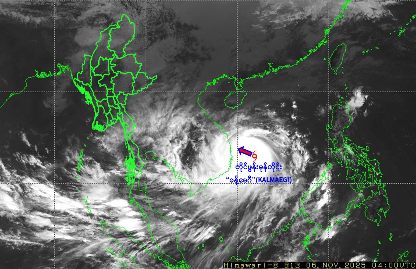 ယနေ့မြန်မာစံတော်ချိန် ၁၀:၃၀ နာရီအချိန် တိုင်းထွာချက်များအရ တောင်တရုတ်ပင်လယ်ပြင်တွင် ဖြစ်ပေါ်နေသော တိုင်ဖွန်းမုန်တိုင်း “ခန့်မေဂီ” (KALMAEGI) သည် အနောက်ဘက်သို့ ရွေ့လျားခဲ့ပြီး ဗီယက်နမ်နိုင်ငံ၊ ဒါနန်းမြို့ (Da Nang) ၏ အရှေ့တောင်ဘက် ရေမိုင် ၂၆၀ မိုင်ခန့်အကွာ ပင်လယ်ပြင်ကို ဗဟိုပြုနေပါသည်။