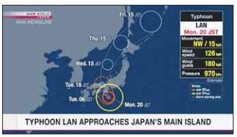 တိုင်ဖွန်းမုန်တိုင်း “လန်သည် ဂျပန်နိုင်ငံ၏ ပင်မကျွန်းဖြစ်သည့် ဟွန်ရှူးကျွန်းပေါ်သို့ ဦးတည်ရွေ့လျား လာနေကြောင်း သိရသည်။ အိုဆာကာ၊ ကျိုတိုနှင့် နာဂိုယာတို့သည် မုန်တိုင်းလမ်းကြောင်းတွင် ကျရောက် နိုင်ဖွယ်ရှိသည့် အဓိကမြို့ကြီးများဖြစ်သည်။