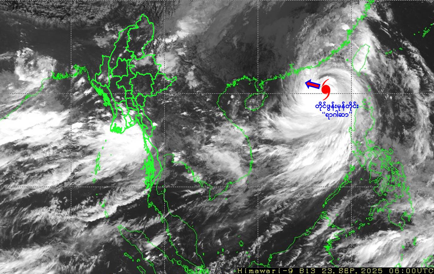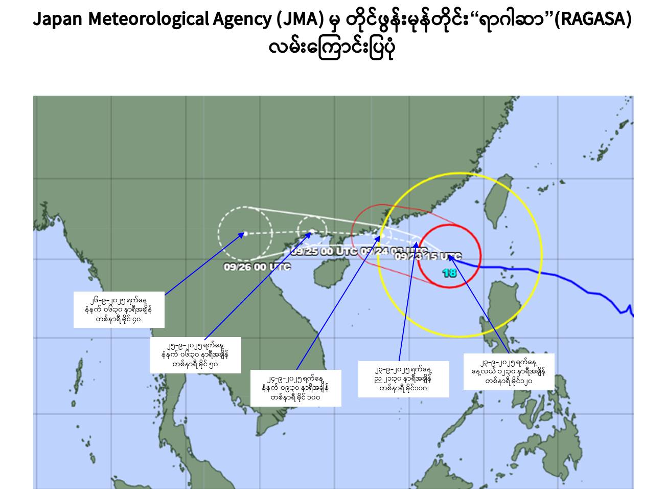 ယနေ့မြန်မာစံတော်ချိန် ၁၂:၃၀ နာရီအချိန် တိုင်းထွာချက်များအရ တောင်တရုတ်ပင်လယ်ပြင်တွင် ဖြစ်ပေါ်နေသော တိုင်ဖွန်းမုန်တိုင်း “ရာဂါဆာ” (RAGASA) သည် အနောက်ဘက်သို့ရွေ့လျားခဲ့ပြီး ဆက်လက် တည်ရှိနေပါသည်။ အဆိုပါ တိုင်ဖွန်းမုန်တိုင်း “ရာဂါဆာ” သည် အနောက်-အနောက်မြောက်ဘက်သို့ ဆက်လက်ရွေ့လျားနိုင်ပြီး ၂၄-၉-၂၀၂၅ ရက်နေ့တွင် တရုတ်နိုင်ငံတောင်ပိုင်းကမ်းရိုးတန်းဒေသများကို ဖြတ်ကျော်ဝင်ရောက်နိုင်ပါသည်။ ထိုမှတစ်ဆင့် ၂၅-၉-၂၀၂၅ ရက်နေ့တွင် ဗီယက်နမ်နိုင်ငံမြောက်ပိုင်း ကမ်းခြေဒေသများကို အပူပိုင်းမုန်တိုင်းအဖြစ်ဖြင့် ဖြတ်ကျော်နိုင်သည်ဟု ခန့်မှန်းရပါသည်။