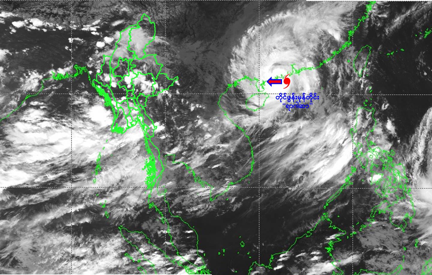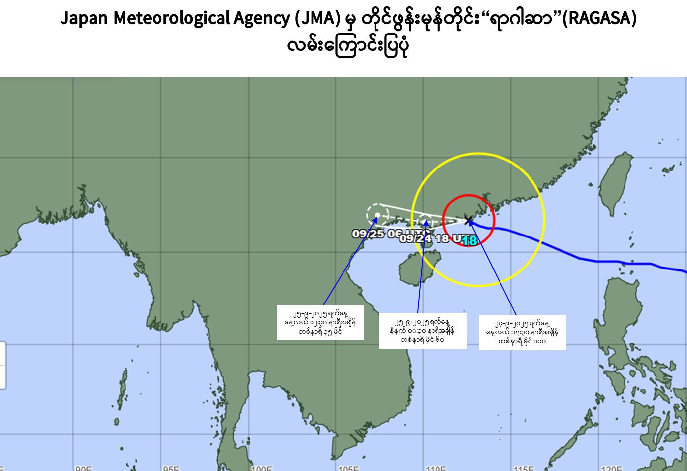 ယနေ့မြန်မာစံတော်ချိန် ၁၅:၃၀ နာရီအချိန် တိုင်းထွာချက်များအရ တောင်တရုတ် ပင်လယ်ပြင်တွင် ဖြစ်ပေါ်ခဲ့သော တိုင်ဖွန်းမုန်တိုင်း “ရာဂါဆာ” (RAGASA)သည် အနောက်- အနောက်မြောက်ဘက်သို့ ရွေ့လျားခဲ့ပြီး တရုတ်နိုင်ငံ၊ ရှချွမ်ကျွန်း (Xiachuan Island) မှ ဖြတ်ကျော်ခဲ့ကာ တရုတ်နိုင်ငံ၊ ရန်ကျမ်းမြို့ (Yangjiang) ၏ အရှေ့- အရှေ့တောင်ဘက် ရေမိုင် ၃၀ မိုင်ခန့်အကွာ ပင်လယ်ပြင်ကို ဗဟိုပြုနေပါသည်။