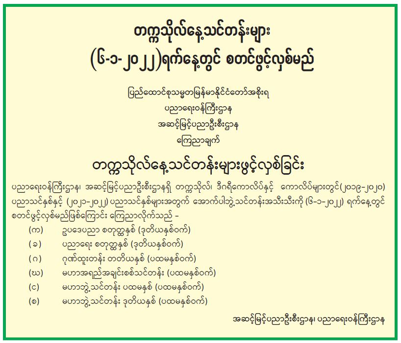 တက္ကသိုလ်နေ့သင်တန်းများ (၆-၁-၂၀၂၂)ရက်နေ့တွင် စတင်ဖွင့်လှစ်မည်