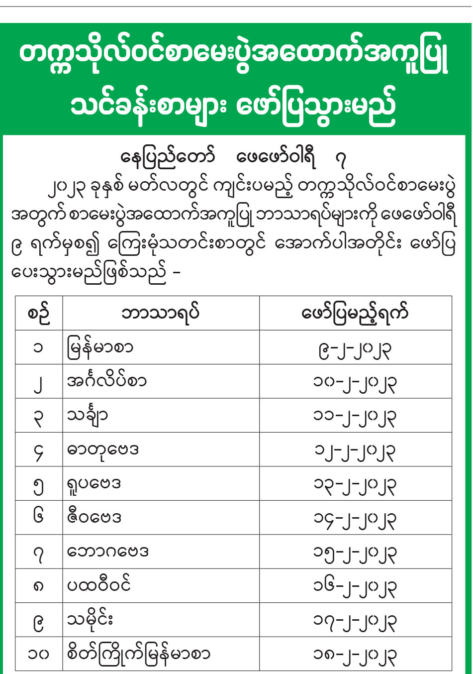 တက္ကသိုလ်ဝင်စာမေးပွဲအထောက်အကူပြု သင်ခန်းစာများ ဖော်ပြသွားမည်
