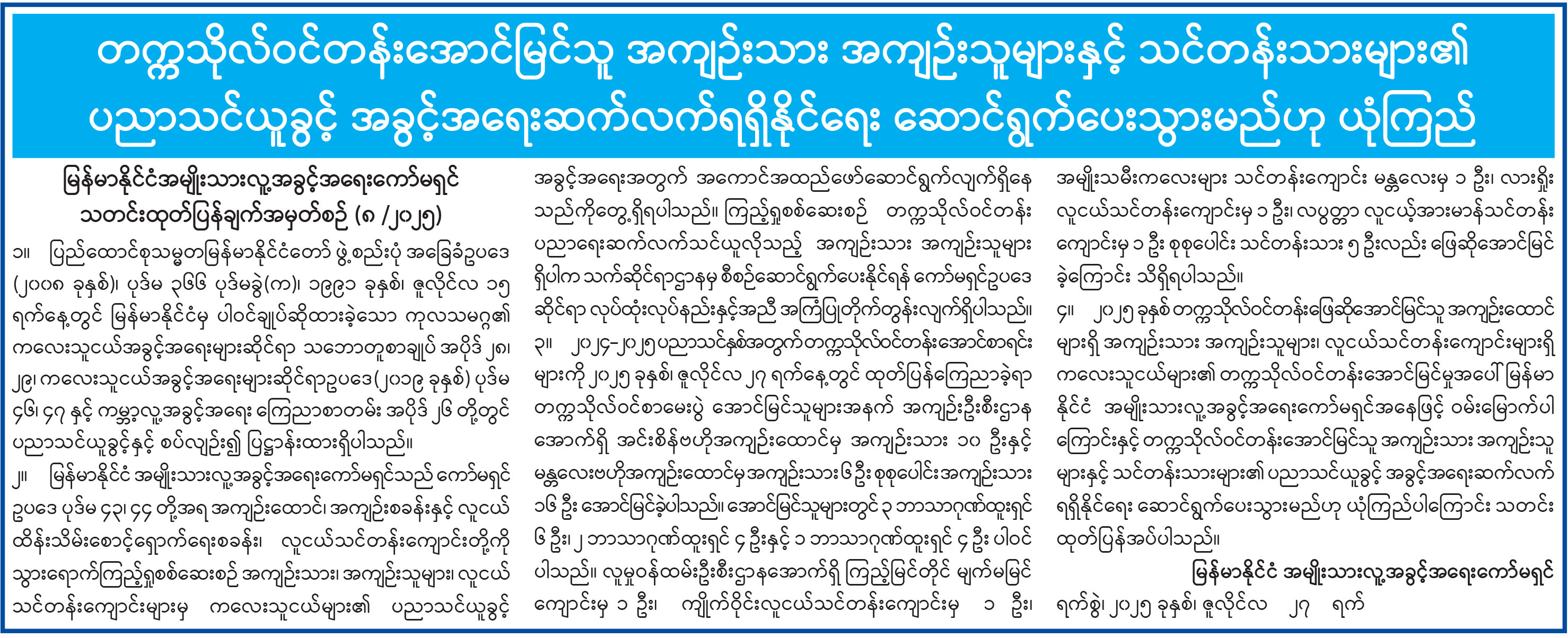 တက္ကသိုလ်ဝင်တန်းအောင်မြင်သူ အကျဉ်းသား အကျဉ်းသူများနှင့် သင်တန်းသားများ၏ ပညာသင်ယူခွင့် အခွင့်အရေးဆက်လက်ရရှိနိုင်ရေး ဆောင်ရွက်ပေးသွားမည်ဟု ယုံကြည်