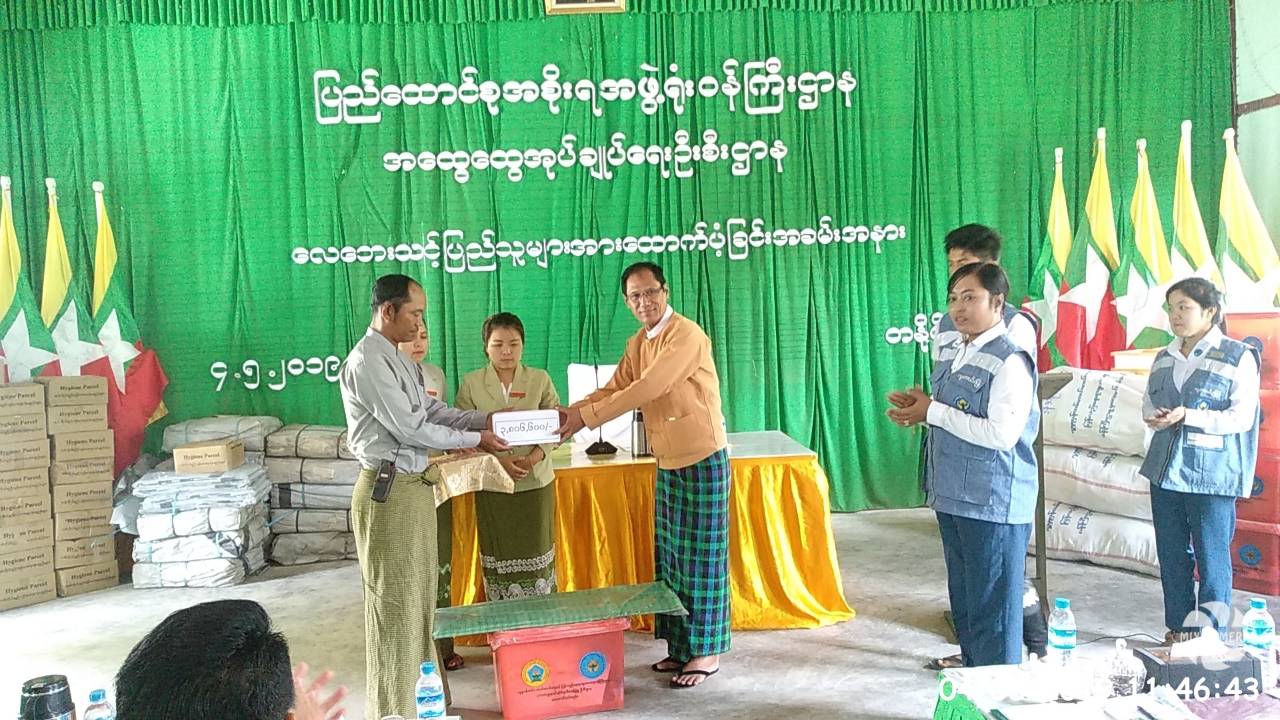 ဆက်လက်၍ ကချင်ပြည်နယ် ကြက်ခြေနီတပ်ဖွဲ့မှူး ဦးဒေါင်ဟောင်းမှ လေဘေးသင့်ပြည်သူများအား အိမ်ထောင်စု (၃၅)စုအတွက် (၁)စုလျှင် တစ်ကိုယ်ရည် ကျန်းမာရေးသုံး (၁၁)မျိုးပါ ပစ္စည်းများနှင့် မိုးကာများကိုလည်းကောင်း၊ တစ်အိမ်ထောင် ကျပ် ၆၀ဝ၀ဝ နှုန်းဖြင့် အိမ်ထောင် (၃၅)စုအတွက် စုစုပေါင်း ပစ္စည်းတန်ဖိုး ကျပ် ၂၁၀ဝ၀ဝ၀ ကို ကချင်ပြည်နယ် အစိုးရအဖွဲ့ လူမှုရေးဝန်ကြီး ဦးနေဝင်းနှင့် တာဝန်ရှိသူများက အသီးသီးထောက်ပံ့ပေးအပ်ခဲ့ကြကြောင်း သိရသည်။