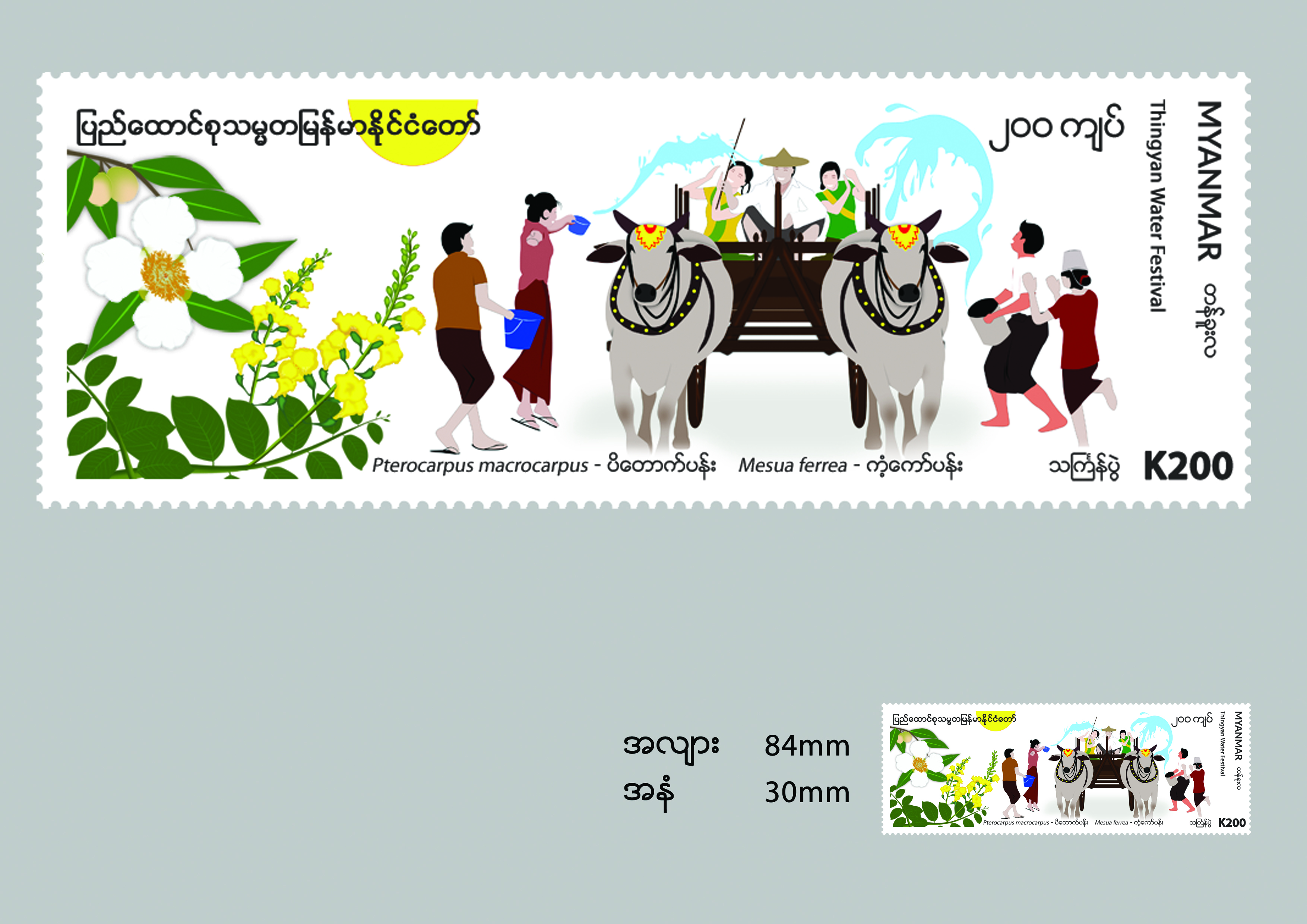 ပို့ဆောင်ရေးနှင့်ဆက်သွယ်ရေးဝန်ကြီးဌာန၊ မြန်မာ့စာတိုက်လုပ်ငန်းမှ ၁၂ လရာသီ ပွဲတော်များနှင့် ပန်းများအထိမ်းအမှတ်၊ တန်ခူးလအတွက် သင်္ကြန်ပွဲနှင့် ပိတောက်ပန်း၊ ကံ့ကော်ပန်းပါ ၂၀ဝ ကျပ်တန် အထူးထုတ် စာပို့တံ ဆိပ်ခေါင်းသစ်(၁)မျိုးကို ၂၀၁၉ခုနှစ်၊ ဧပြီ ၅ ရက်၊ မြန်မာ့သက္ကရာဇ် ၁၃၈၀ ပြည်နှစ်၊တန်ခူးလဆန်း ၁ ရက်၊ သောကြာနေ့၊ နံနက် ၉ နာရီခွဲမှစတင်၍တိုင်း ဒေသကြီး/ပြည်နယ်များရှိ လုပ်ငန်းပြည့်စာတိုက် အသီးသီးတွင် ရောင်းချပေးသွားမည် ဖြစ်သည်။