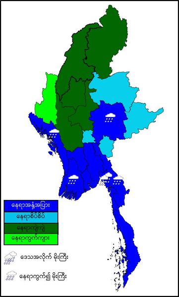 မနက်ဖြန်နံနက်အထိခန့်မှန်းချက်။ ချင်းပြည်နယ်တွင် နေရာကွက်ကျား၊ စစ်ကိုင်းတိုင်းဒေသကြီး၊ မန္တလေးတိုင်းဒေသကြီး၊ မကွေးတိုင်းဒေသကြီးနှင့် ကချင်ပြည်နယ်တို့တွင် နေရာကျဲကျဲ၊ နေပြည်တော်၊ ရှမ်းပြည်နယ်(မြောက်ပိုင်းနှင့် အရှေ့ပိုင်း)နှင့် ကယားပြည်နယ်တို့တွင် နေရာစိပ်စိပ်နှင့် ကျန်တိုင်းဒေသကြီးနှင့်ပြည်နယ်တို့တွင် နေရာအနှံ့အပြား မိုးထစ်ချုန်းရွာပြီး၊ မွန်ပြည်နယ်တွင် ဒေသအလိုက်နှင့် ဧရာဝတီတိုင်းဒေသကြီး၊ ရှမ်းပြည်နယ်(တောင်ပိုင်း)၊ ရခိုင်ပြည်နယ်နှင့် ကရင်ပြည်နယ်တို့တွင် နေရာကွက်၍ မိုးကြီးနိုင်ပါသည်။ ရွာရန်ရာနှုန်းပြည့် ဖြစ်ပါသည်။