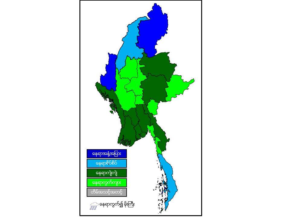 မနက်ဖြန်နံနက်အထိခန့်မှန်းချက်မှာ ကချင်ပြည်နယ်နှင့် ချင်းပြည်နယ် တို့တွင် နေရာအနှံ့အပြား၊ စစ်ကိုင်းတိုင်းဒေသကြီးအထက်ပိုင်းနှင့် တနင်္သာရီတိုင်းဒေသကြီးတို့တွင် နေရာစိပ်စိပ်၊ ပဲခူးတိုင်းဒေသကြီး၊ ရန်ကုန်တိုင်းဒေသကြီး၊ ဧရာဝတီတိုင်းဒေသကြီး၊ ရှမ်းပြည်နယ် (မြောက်ပိုင်း နှင့် တောင်ပိုင်း)၊ ရခိုင်ပြည်နယ်နှင့် ကရင်ပြည်နယ် တို့တွင် နေရာကျဲကျဲနှင့် ကျန် တိုင်းဒေသကြီးနှင့် ပြည်နယ် တို့တွင် နေရာကွက်ကျား မိုးထစ်ချုန်းရွာမည်။ ရွာရန်ရာနှုန်းပြည့် ဖြစ်ပါသည်။