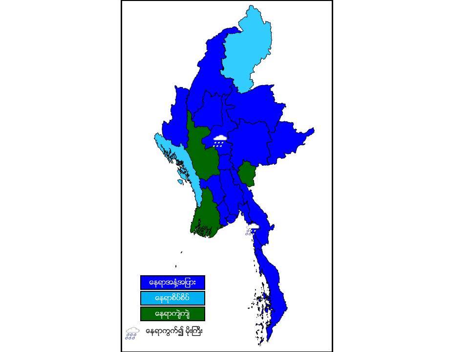 လာမည့်စနေ၊ တနင်္ဂနွေအားလပ်ရက်များအတွက် မိုးလေဝသခန့်မှန်းချက်မှာ နေပြည်တော်၊ မန္တလေးတိုင်းဒေသကြီးနှင့် ရန်ကုန်တိုင်းဒေသကြီး တို့တွင် နေရာအနှံ့အပြား မိုးထစ်ချုန်းရွာမည်။