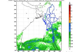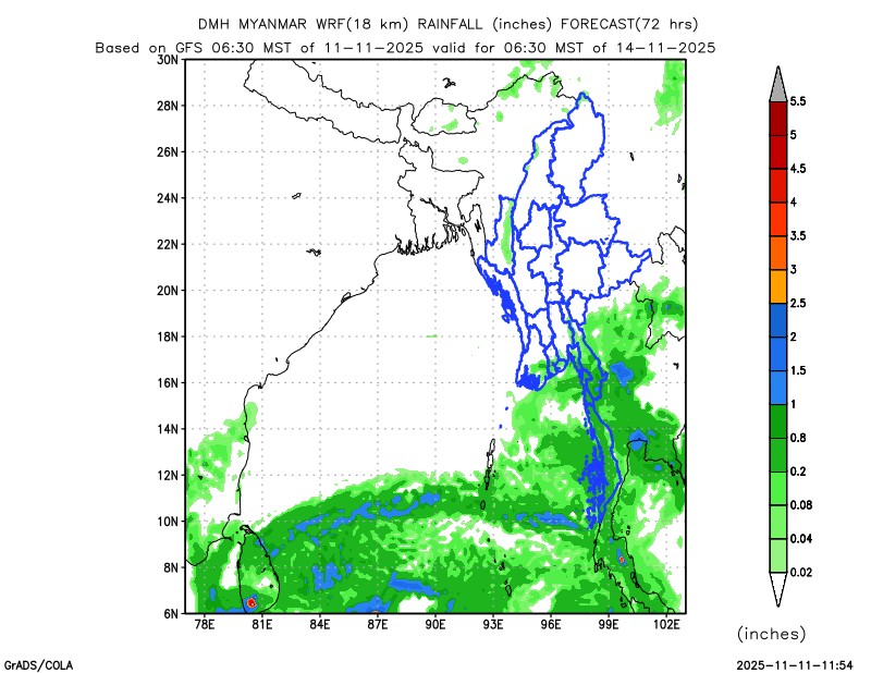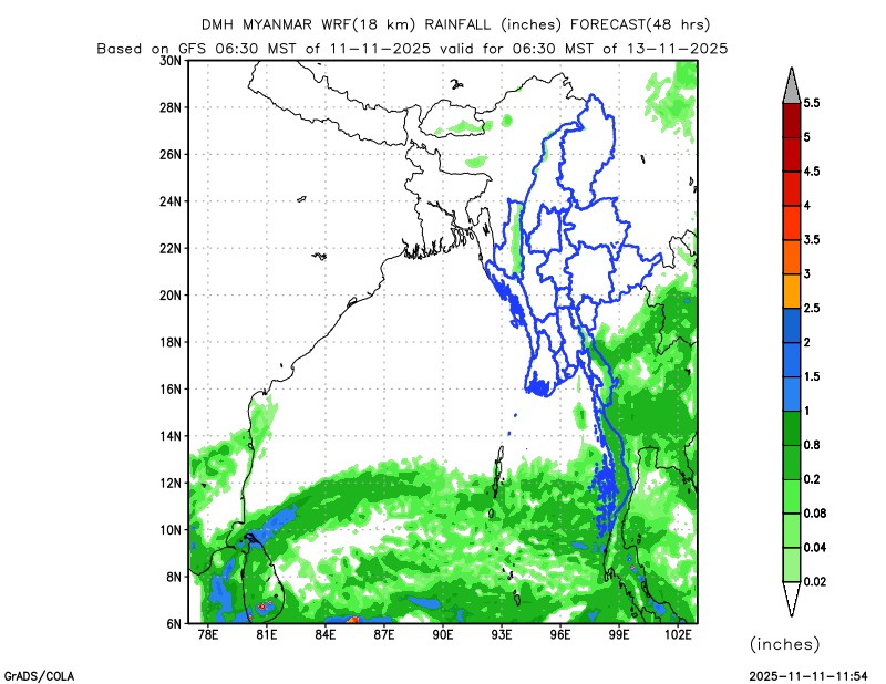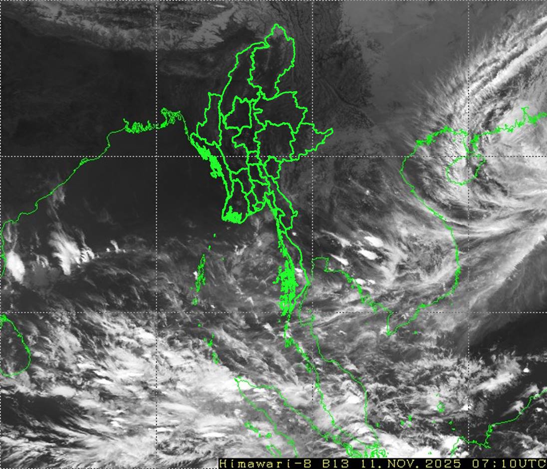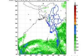 ယမန်နေ့နံနက် ၀၉:၃၀ နာရီအချိန်မှ ယနေ့နံနက် ၀၉:၃၀ နာရီအချိန်အထိ မိုးလေဝသတိုင်းထွာချက် အကျဉ်းချုပ်။ လွန်ခဲ့သော ၂၄ နာရီအတွင်းက ကရင်ပြည်နယ်နှင့် မွန်ပြည်နယ်တို့တွင် နေရာအနှံ့အပြား၊ တနင်္သာရီတိုင်းဒေသကြီးတွင် နေရာစိပ်စိပ်၊ ဧရာဝတီတိုင်းဒေသကြီးနှင့် ကချင်ပြည်နယ်တို့တွင် နေရာကျဲကျဲနှင့် ရန်ကုန်တိုင်းဒေသကြီး၊ ပဲခူးတိုင်းဒေသကြီးနှင့် ရှမ်းပြည်နယ်(အရှေ့ပိုင်း)တို့တွင် နေရာကွက်ကျား မိုးထစ်ချုန်းရွာခဲ့ပြီး၊ ကရင်ပြည်နယ်တွင် နေရာကွက်၍ မိုးကြီးခဲ့ကာ ကျန်တိုင်းဒေသကြီးနှင့် ပြည်နယ်တို့တွင် တိမ်အသင့်အတင့် ဖြစ်ထွန်းခဲ့ပါသည်။ ညအပူချိန်များမှာ ချင်းပြည်နယ်တွင် နိုဝင်ဘာလ၏ ပျမ်းမျှအပူချိန်အောက် ၂ ဒီဂရီဆဲလ်စီးယပ် လျော့နည်းခဲ့ပြီး၊ မကွေးတိုင်းဒေသကြီးနှင့် စစ်ကိုင်းတိုင်းဒေသကြီးအောက်ပိုင်းတို့တွင် နိုဝင်ဘာလ၏ ပျမ်းမျှအပူချိန်တို့ထက် ၂ ဒီဂရီဆဲလ်စီးယပ်၊ နေပြည်တော်နှင့် ကချင်ပြည်နယ်တို့တွင် နိုဝင်ဘာလ၏ ပျမ်းမျှအပူချိန်တို့ထက် ၃ ဒီဂရီဆဲလ်စီးယပ်မှ ၄ ဒီဂရီဆဲလ်စီးယပ်အထိနှင့် ရှမ်းပြည်နယ်(အရှေ့ပိုင်း)တွင် နိုဝင်ဘာလ၏ ပျမ်းမျှအပူချိန်ထက် ၇ ဒီဂရီဆဲလ်စီးယပ်ပိုခဲ့ကာ ကျန်တိုင်းဒေသကြီးနှင့် ပြည်နယ်တို့တွင် နိုဝင်ဘာလ၏ ပျမ်းမျှအပူချိန်ခန့်သာ ရှိခဲ့ပါသည်။ ထူးခြားသည့် ညအပူချိန်များမှာ ဟားခါးမြို့တွင် ၅.၆ ဒီဂရီဆဲလ်စီးယပ်၊ လွိုင်လင်မြို့တွင် ၉.၀ ဒီဂရီဆဲလ်စီးယပ်၊ နမ့်စန်မြို့ (ရှမ်းပြည်နယ်တောင်ပိုင်း) တွင် ၁၁.၀ ဒီဂရီဆဲလ်စီးယပ်၊ ပင်လောင်းမြို့တွင် ၁၁.၅ ဒီဂရီဆဲလ်စီးယပ်၊ တောင်ကြီးမြို့တွင် ၁၂.၀ ဒီဂရီဆဲလ်စီးယပ်၊ ဟုမ္မလင်းမြို့တွင် ၁၂.၂ ဒီဂရီဆဲလ်စီးယပ်နှင့် ပြင်ဦးလွင်မြို့တွင် ၁၂.၃ ဒီဂရီ ဆဲလ်စီးယပ်တို့ ဖြစ်ကြပါသည်။ မှတ်သားဖွယ်ရာ မိုးရေချိန်များမှာ ဘားအံ(စိုက်ပျိုးရေးမိုးလေဝသ)တွင် ၃.၁၉ လက်မ၊ ပေါင်မြို့တွင် ၂.၂၄ လက်မ၊ ချောင်းဆုံမြို့တွင် ၁.၆၅ လက်မ၊ ဘားအံမြို့၊ သထုံမြို့နှင့် ကျိုက်မရောမြို့တို့တွင် ၁.၅၀ လက်မစီ၊ ကော့ကရိတ်မြို့တွင် ၀.၈၃ လက်မ၊ မုဒုံမြို့တွင် ၀.၇၅ လက်မ၊ မော်လမြိုင်မြို့တွင် ၀.၇၁ လက်မနှင့် ကျိုက္ခမီမြို့တွင် ၀.၅၉ လက်မတို့ ဖြစ်ကြပါသည်။