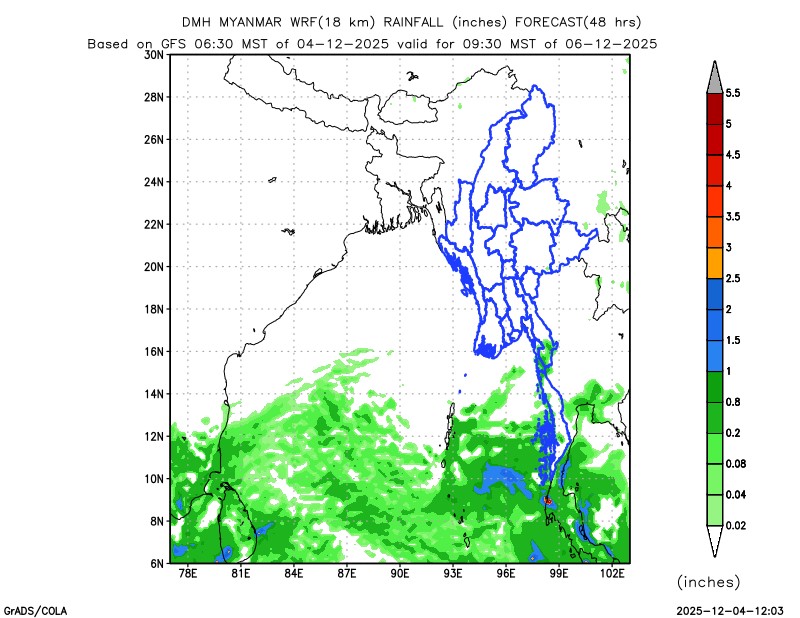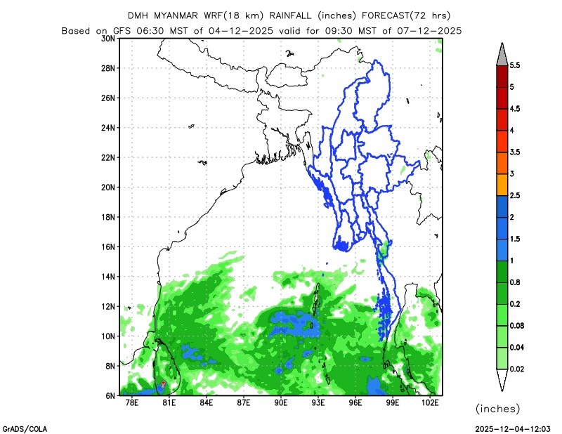 နောက် ၂ ရက်အတွက်ခန့်မှန်းချက်။ တနင်္သာရီတိုင်းဒေသကြီး၊ ကရင်ပြည်နယ်နှင့် မွန်ပြည်နယ်တို့တွင် နေရာကွက်ကျား မိုးအနည်းငယ် ရွာနိုင်ပါသည်။