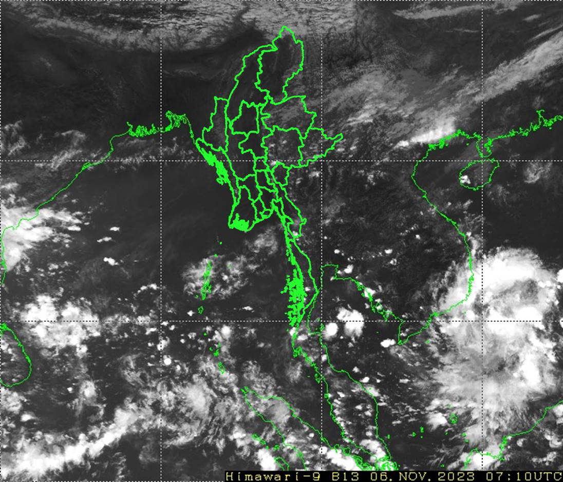 ဘင်္ဂလားပင်လယ်အော်အခြေအနေ။ ဘင်္ဂလားပင်လယ်အော်အရှေ့အလယ်ပိုင်းတွင် တိမ်အနည်းငယ် ဖြစ်ထွန်းနေပြီး၊ ကပ္ပလီပင်လယ်ပြင်နှင့် ကျန် ဘင်္ဂလားပင်လယ်အော်တို့တွင် တိမ်အသင့်အတင့်မှ တိမ်ထူထပ်နေပါသည်။