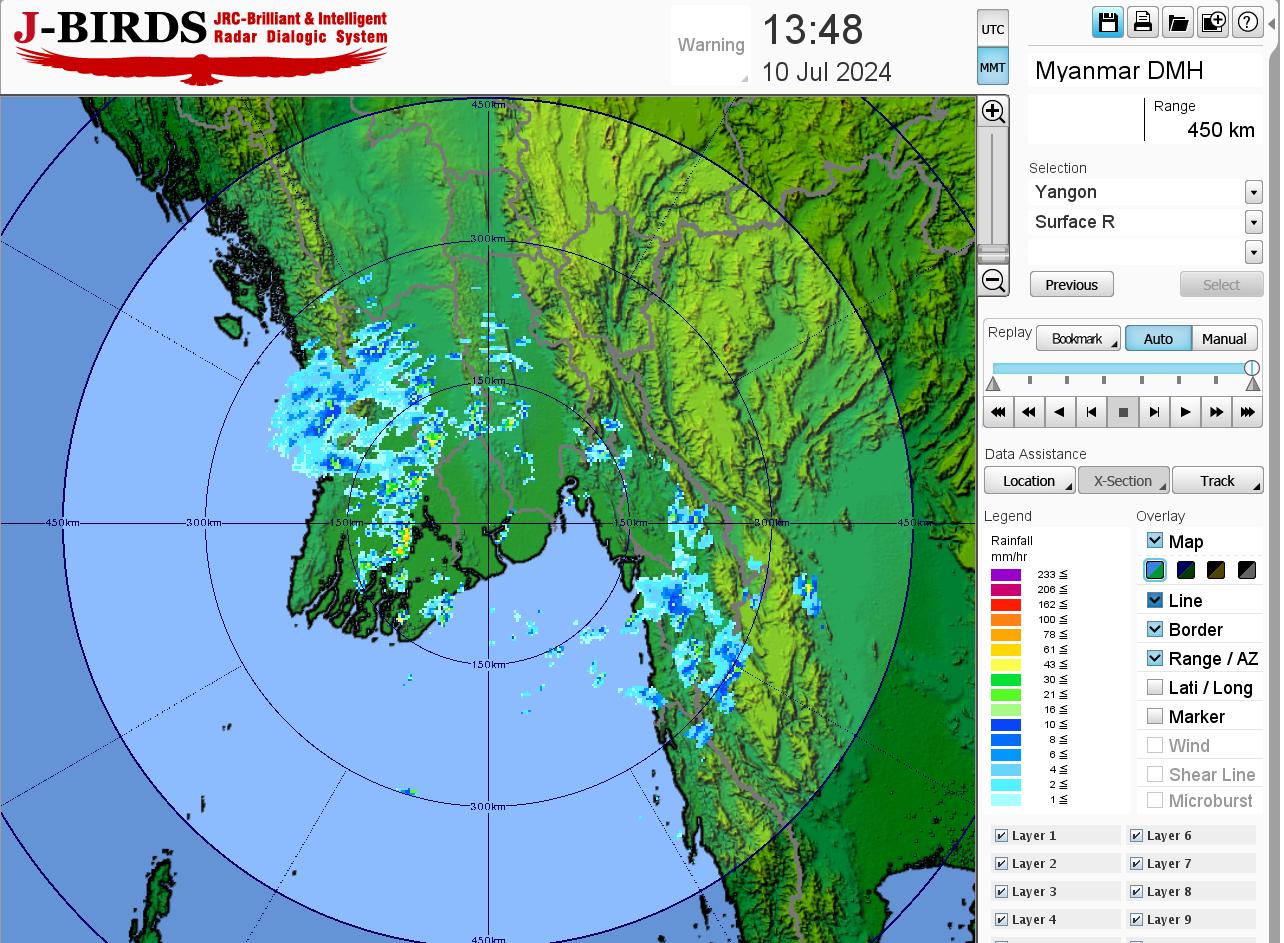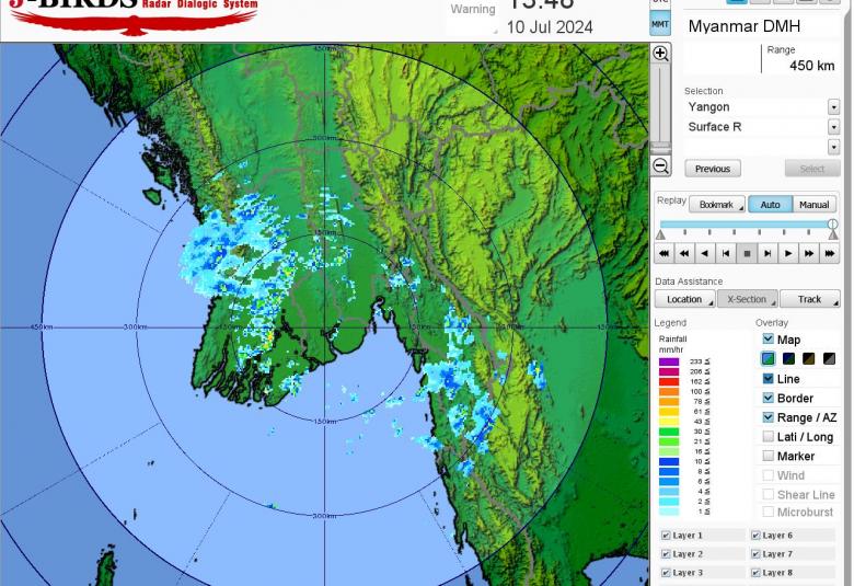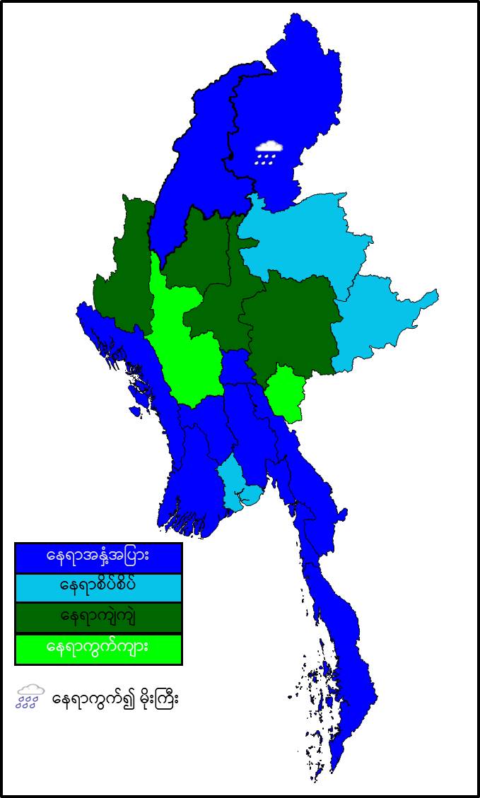 မနက်ဖြန်နံနက်အထိခန့်မှန်းချက်။ မကွေးတိုင်းဒေသကြီးနှင့် ကယားပြည်နယ်တို့တွင် နေရာကွက်ကျား၊ စစ်ကိုင်းတိုင်းဒေသကြီးအောက်ပိုင်း၊ မန္တလေးတိုင်းဒေသကြီး၊ ရှမ်းပြည်နယ်(တောင်ပိုင်း)နှင့် ချင်းပြည်နယ်တို့တွင် နေရာကျဲကျဲ၊ ရန်ကုန်တိုင်းဒေသကြီးနှင့် ရှမ်းပြည်နယ်(မြောက်ပိုင်းနှင့် အရှေ့ပိုင်း)တို့တွင် နေရာစိပ်စိပ်နှင့် ကျန်တိုင်းဒေသကြီးနှင့် ပြည်နယ်တို့တွင် နေရာအနှံ့အပြား မိုးထစ်ချုန်းရွာပြီး၊ ကချင်ပြည်နယ်တွင် နေရာကွက်၍ မိုးကြီးနိုင်ပါသည်။ ရွာရန်ရာနှုန်းပြည့် ဖြစ်ပါသည်။